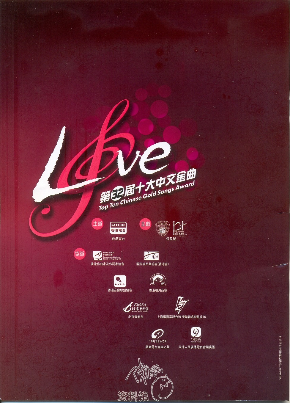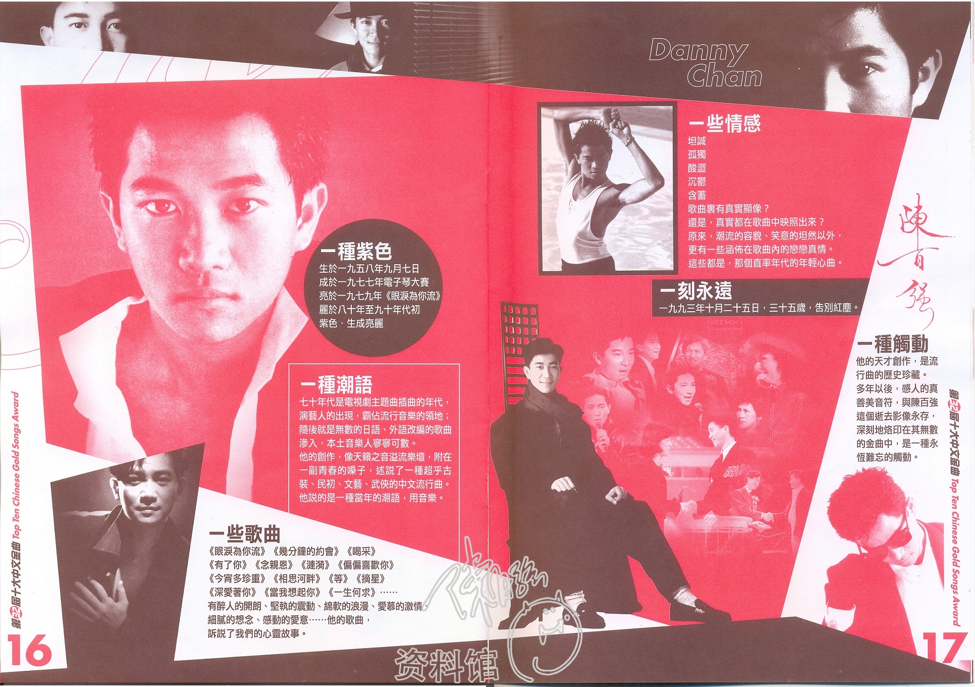 2009 年度第三十二屆十大中文金曲頒獎典禮金曲場刊 2024-09-202016-03-28 作者 Kark2009年度「第三十二屆十大中文金曲頒獎典禮」於2010年01月30日舉行,是屆金針獎是追頒金針獎予陳百強。 「十大中文金曲」製作總監周國豐表示,鑑於去年是Danny 從事娛樂事業的三十周年紀念,故大會特別頒發此獎項作表揚。2009年度「第三十二屆十大中文金曲頒獎典禮」場刊﹝封面﹞2009年度「第三十二屆十大中文金曲頒獎典禮」金針獎 陳百強2009年度「第三十二屆十大中文金曲頒獎典禮」場刊﹝封底﹞