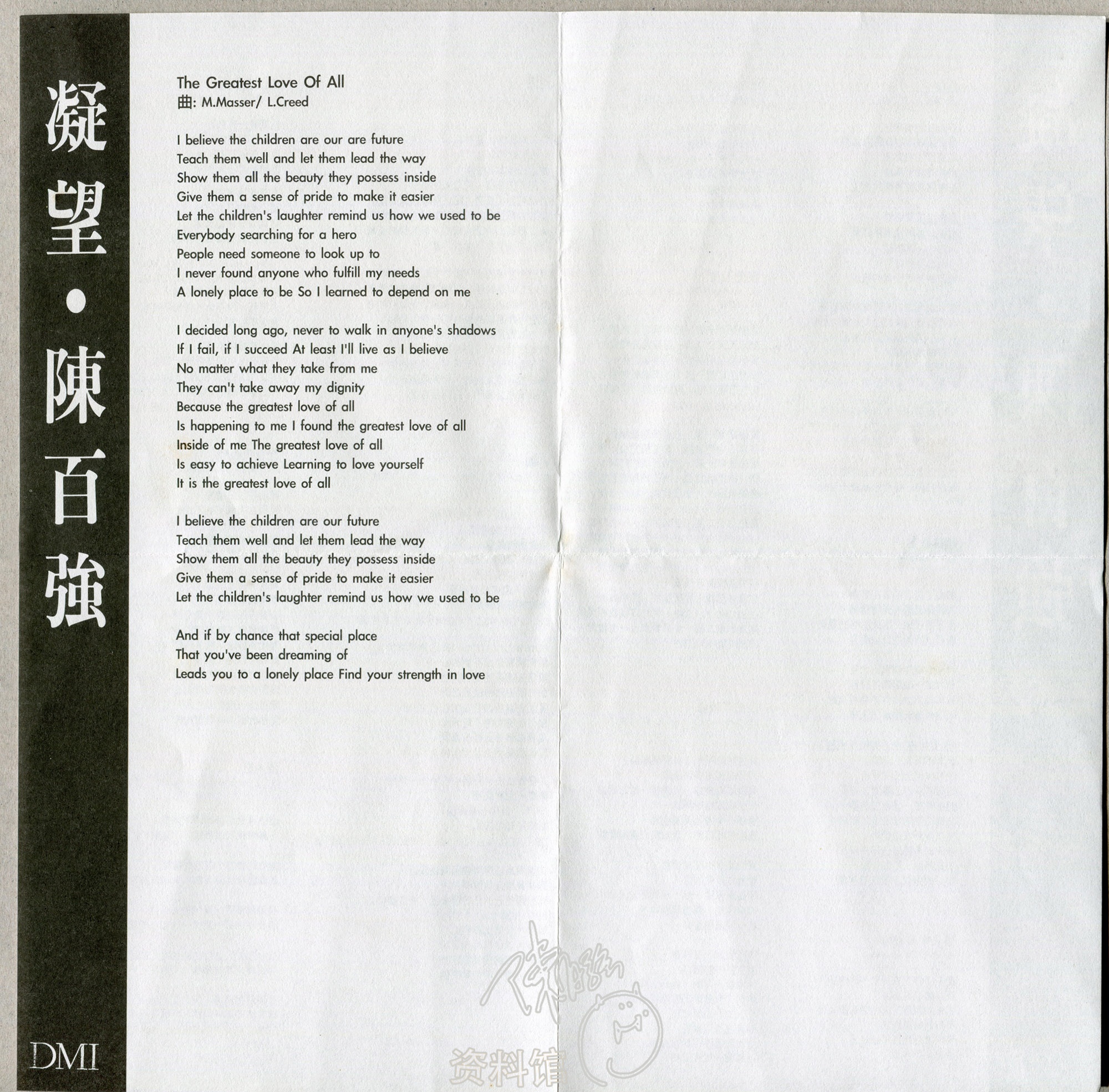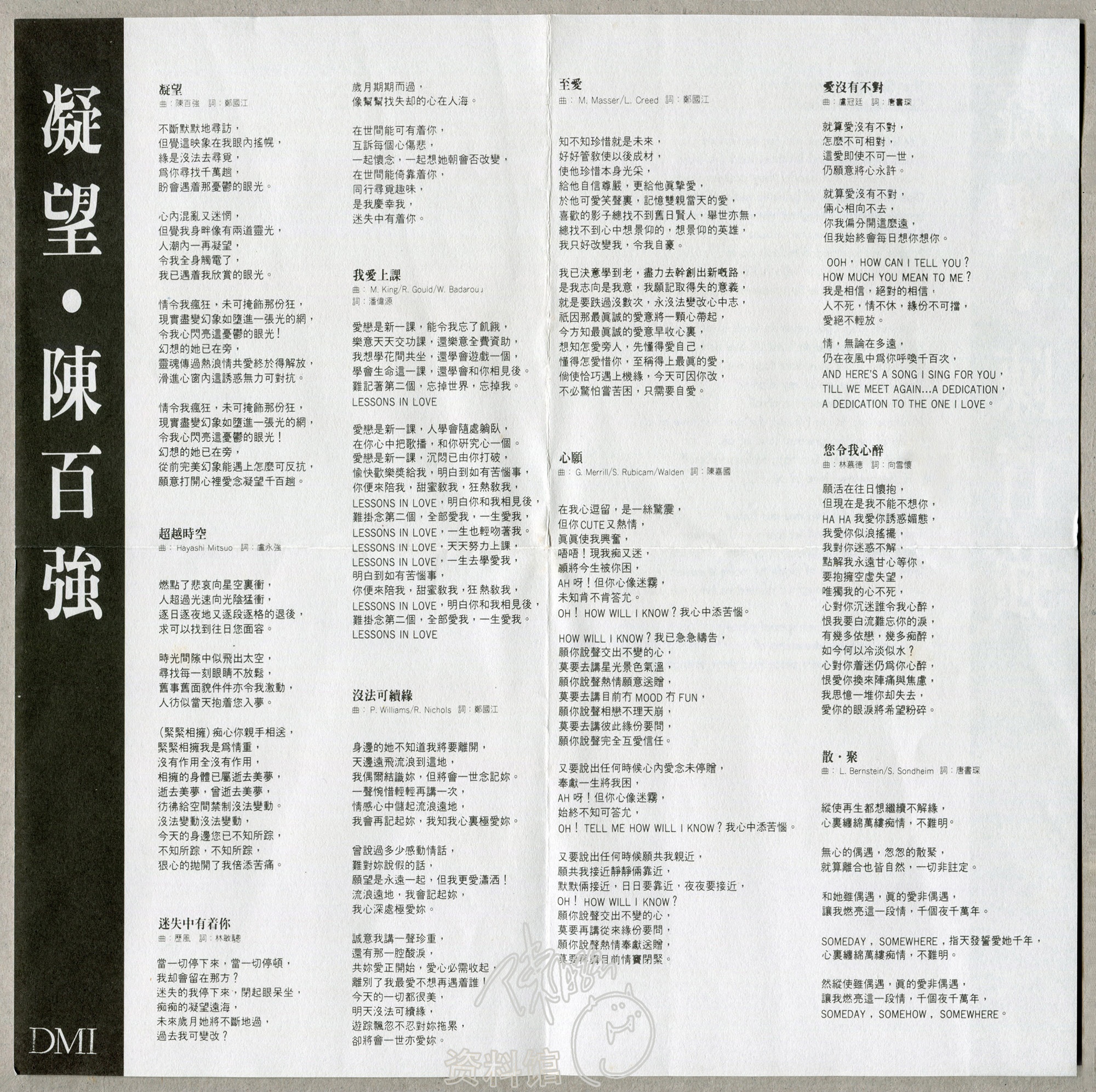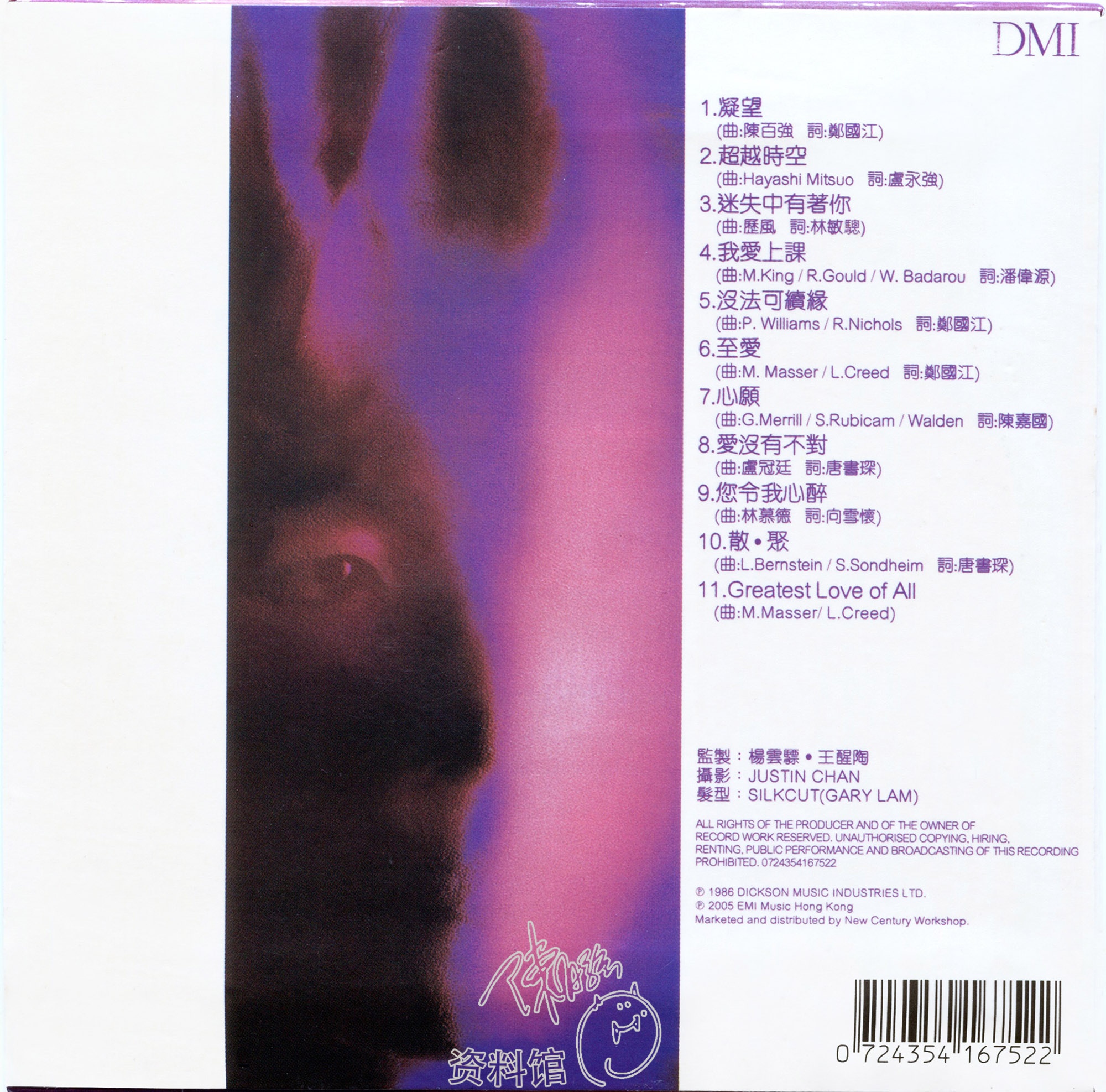 首页 » 大碟欣赏 » 大碟1993年后出版 » 2005 EMI 复刻版CD 凝望2005 EMI 复刻版CD 凝望 2021-09-042016-12-12 作者 Josephine Yao回到旧版专辑歌词专辑内曲目:1.凝望 (1986年第39周香港电台中文歌曲龙虎榜周冠军) 2.超越时空 3.迷失中有着你 4.我爱上课 5.没法可续缘 6.至爱 7.心愿 8.爱没有不对 9.你令我心醉 10.散.聚 11. Greatest Love of All 2005-EMI凝望-复刻版CD-封面 2005-EMI凝望-复刻版CD-封底 2005-EMI凝望-复刻版CD 2005-EMI凝望-复刻版CD-歌词A 2005-EMI凝望-复刻版CD-歌词B