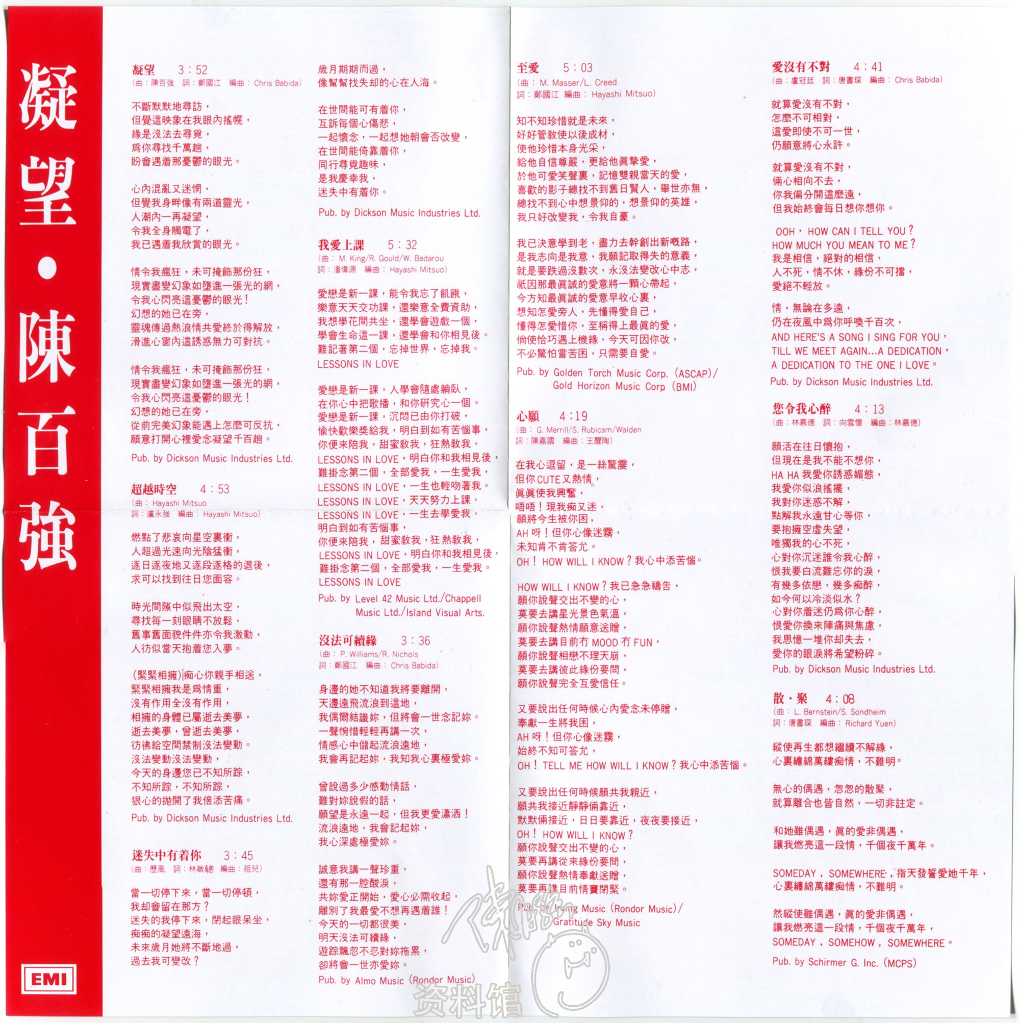 陳百強對黑人音樂特别偏愛,在這張大碟內改編天后Withney Houston的歌曲一共有兩首,一首是「至愛」,另一首是「How Will I Know」由陳嘉國填上新詞的做心願」。