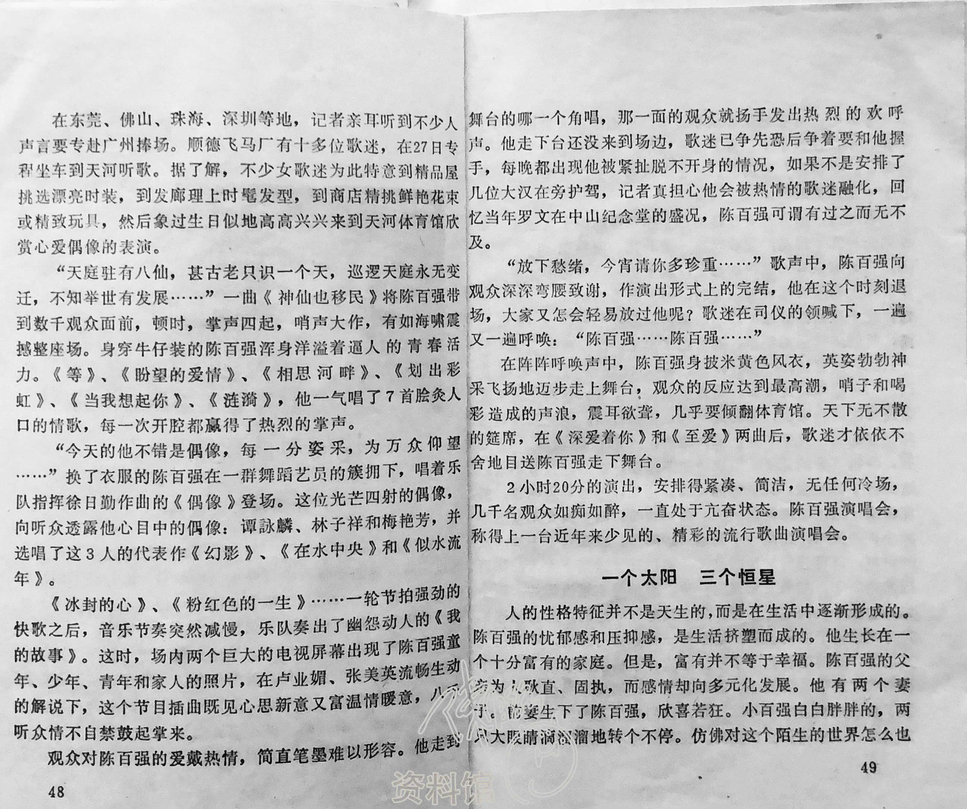 在阵阵呼唤声中,陈百强身披米黄色风衣,英姿勃勃神采飞扬地迈步走上舞台,观众的反应达到最高潮,哨子和喝彩造成的声浪,震耳欲聋,几乎要倾翻体育馆。天下无不散的筵席,在《深爱着你》和《至爱》两曲后,歌迷才依依不舍地目送陈百强走下舞台。