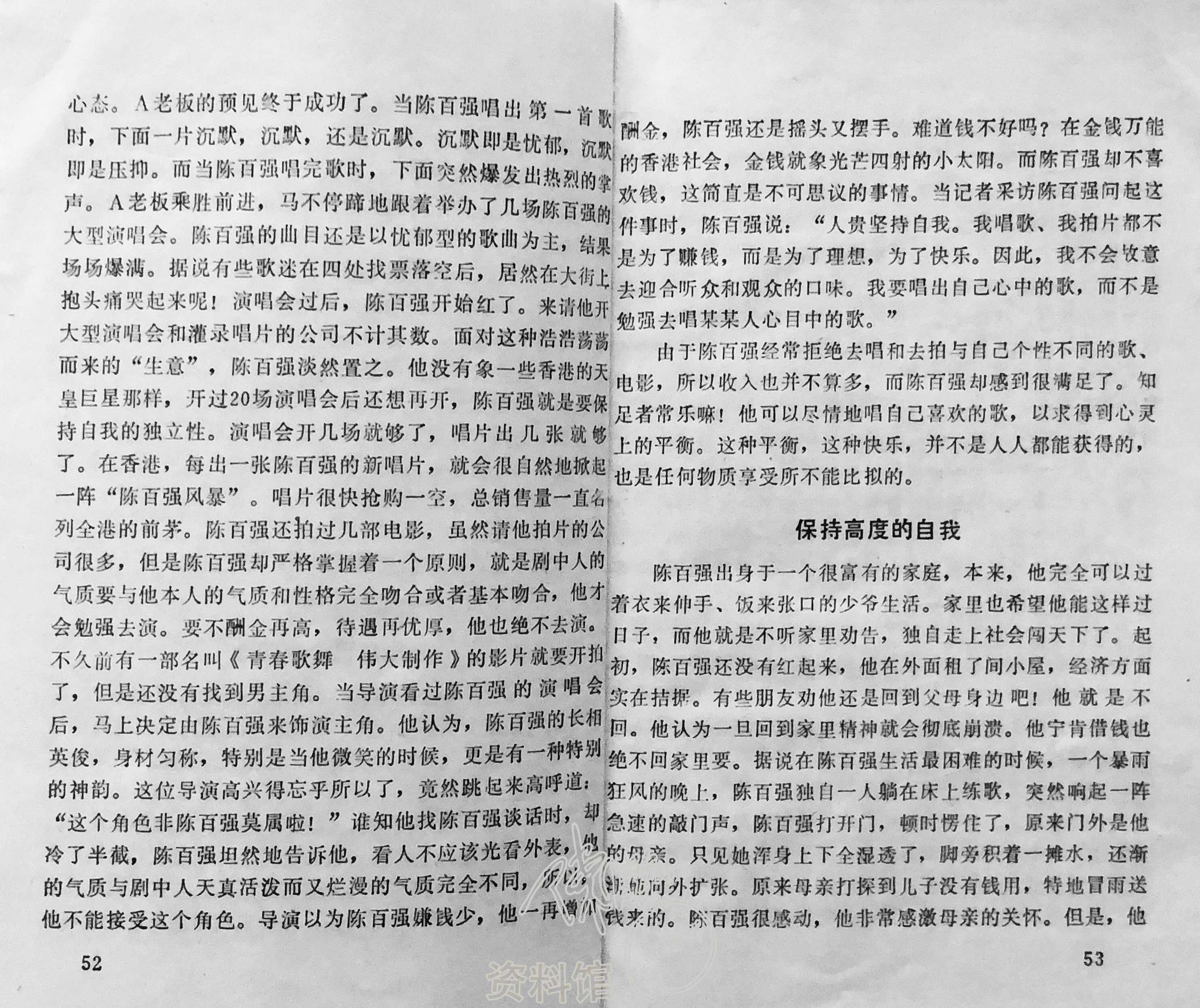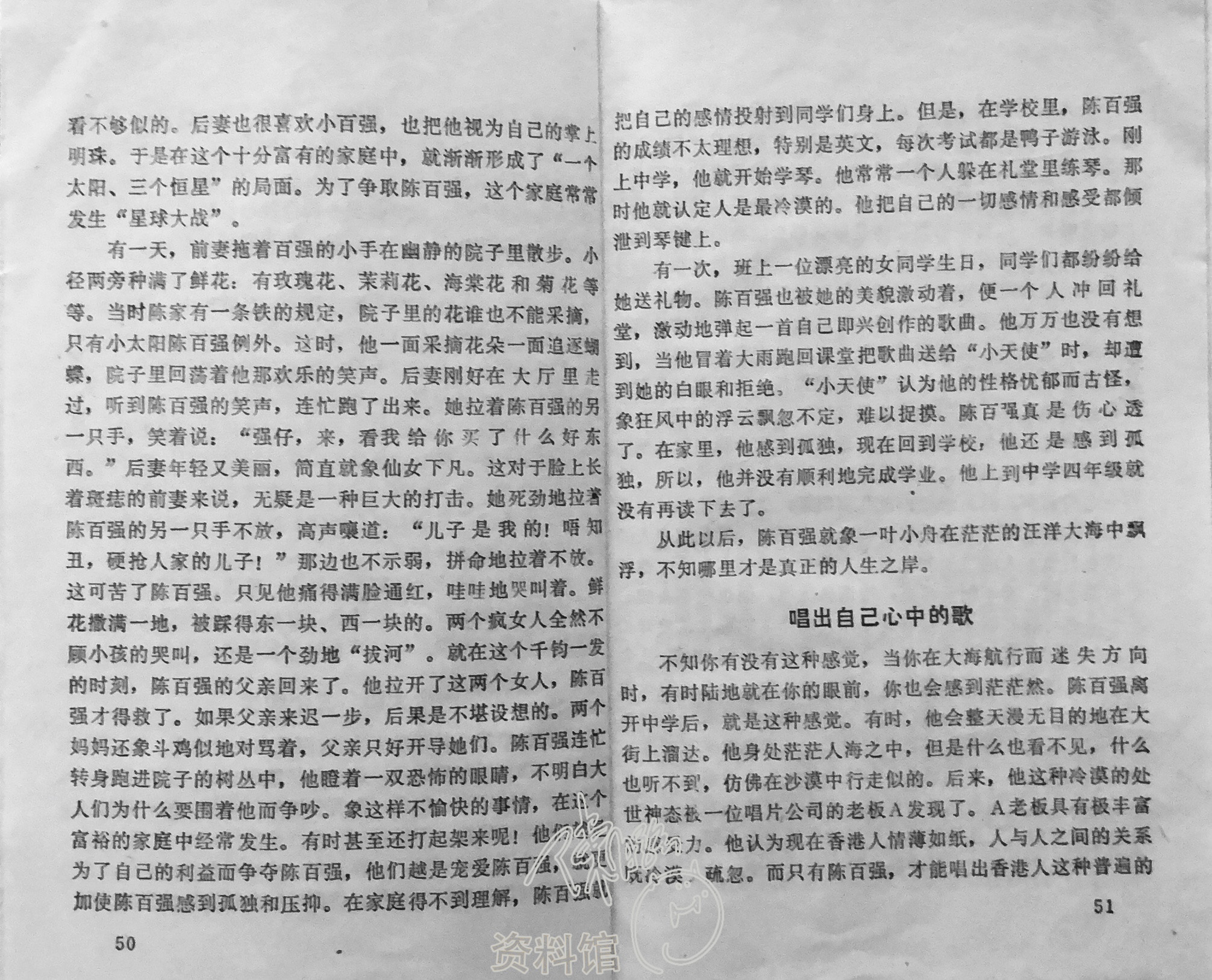 不知你有没有这种感觉,当你在大海航行而迷失方向时,有时陆地就在你的眼前,你也会感到茫茫然。陈百强离开中学后,就是这种感觉。有时,他会整天漫无目的地在大街上溜达。他身处茫茫人海之中,但是什么也看不见,什么也听不到,仿佛在沙漠中行走似的。后来,他这种冷漠的处世神态被一位唱片公司的老板A发现了。A老板具有极丰富的感受力。他认为现在香港人情薄如纸,人与人之间的关系既冷漠又疏忽。而只有陈百强,才能唱出香港人这种普遍的心态。A老板的预见终于成功了。当陈百强唱出第一首歌时,下面一片沉默,沉默,还是沉默。沉默即是优郁,沉默即是压抑。而当陈百强唱完歌时,下面突然爆发出热烈的掌声。A老板乘胜前进,马不停蹄地跟着举办了几场陈百强的大型演唱会。陈百强的曲目还是以忧郁型的歌曲为主,结果场场爆满。据说有些歌迷在四处找票落空后,居然在大街上抱头痛哭起来呢!演唱会过后,陈百强开始红了。来请他开大型演唱会和灌录唱片的公司不计其数。面对这种浩浩荡荡而来的“生意”,陈百强淡然置之。他没有象一些香港的天皇巨星那样,开过20场演唱会后还想再开,陈百强就是要保持自我的独立性。演唱会开几场就够了,唱片出几张就够了。在香港,每出一张陈百强的新唱片,就会很自然地掀起一阵“陈百强风暴”。唱片很快抢购一空,总销售量一直名列全港的前茅。陈百强还拍过几部电影,虽然请他拍片的公司很多,但是陈百强却严格掌握着一个原则,就是剧中人的气质要与他本人的气质和性格完全吻合或者基本吻合,他才会勉强去演。要不酬金再高,待遇再优厚,他也绝不去演。不久前有一部名叫《青春歌舞伟大制作》的影片就要开拍了,但是还没有找到男主角。当导演看过陈百强的演唱会后,马上决定由陈百强来饰演主角。他认为,陈百强的长相英俊,身材匀称,特别是当他微笑的时候,更是有一种特别的神韵。这位导演高兴得忘乎所以了,竟然跳起来高呼道:“这个角色非陈百强莫属啦!”谁知他找陈百强谈话时,却冷了半截,陈百强坦然地告诉他,看人不应该光看外表,他的气质与剧中人天真活泼而又烂漫的气质完全不同,所以,他不能接受这个角色。导演以为陈百强嫌钱少,他一再增加