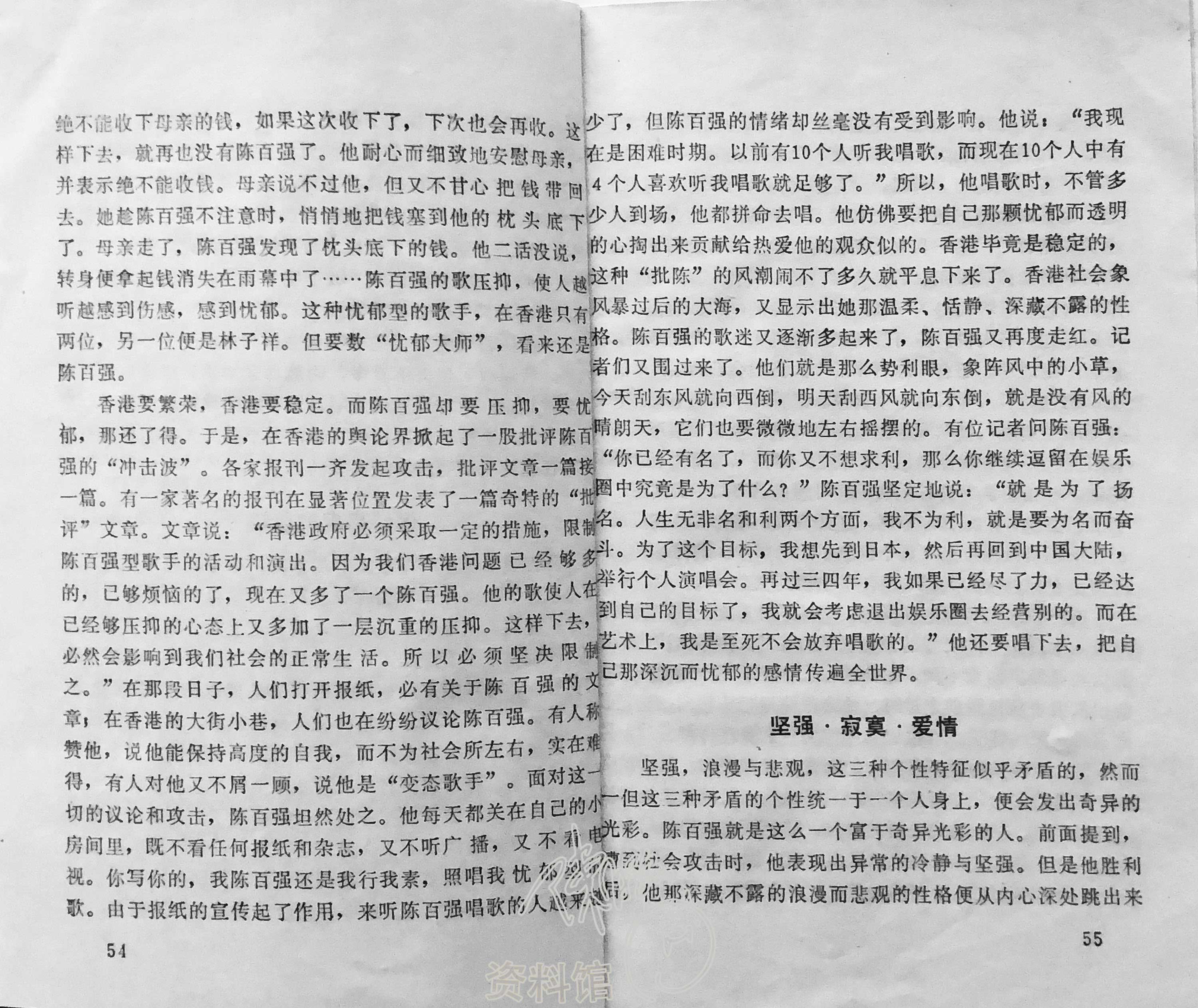 香港要繁荣,香港要稳定。而陈百强却要压抑,要忧郁,那还了得。于是,在香港的舆论界掀起了一股批评陈百强的“冲击波”。各家报刊一齐发起攻击,批评文章一篇接一篇。有一家著名的报刊在显著位置发表了一篇奇特的“批评”文章。文章说:“香港政府必须采取一定的措施,限制陈百强型歌手的活动和演出。因为我们香港问题已经够多的,已够烦恼的了,现在又多了一个陈百强。他的歌使人在已经够压抑的心态上又多加了一层沉重的压抑。这样下去,必然会影响到我们社会的正常生活。所以必须坚决限制之。”在那段日子,人们打开报纸,必有关于陈百强的文章;在香港的大街小巷,人们也在纷纷议论陈百强。有人称赞他,说他能保持高度的自我,而不为社会所左右,实在难得,有人对他又不屑一顾,说他是“变态歌手”。面对这一切的议论和攻击,陈百强坦然处之。他每天都关在自己的小房间里,既不看任何报纸和杂志,又不听广播,又不看电视。你写你的,我陈百强还是我行我素,照唱我忧郁型的歌。由于报纸的宣传起了作用,来听陈百强唱歌的人越来越少了,但陈百强的情绪却丝毫没有受到影响。他说:“我现在是困难时期。以前有10个人听我唱歌,而现在10个人中有4个人喜欢听我唱歌就足够了。”所以,他唱歌时,不管多少人到场,他都拼命去唱。他仿佛要把自己那颗忧郁而透明的心掏出来贡献给热爱他的观众似的。香港毕竟是稳定的,这种“批陈”的风潮闹不了多久就平息下来了。香港社会象风暴过后的大海,又显示出她那温柔、恬静、深藏不露的性格。陈百强的歌迷又逐渐多起来了,陈百强又再度走红。记者们又围过来了。他们就是那么势利眼,象阵风中的小草,今天刮东风就向西倒,明天刮西风就向东倒,就是没有风的晴朗天,它们也要微微地左右摇摆的。有位记者问陈百强:“你已经有名了,而你又不想求利,那么你继续逗留在娱乐圈中究竟是为了什么?”陈百强坚定地说:“就是为了扬名。人生无非名和利两个方面,我不为利,就是要为名而奋斗。为了这个目标,我想先到日本,然后再回到中国大陆,举行个人演唱会。再过三四年,我如果已经尽了力,已经达到自己的目标了,我就会考虑退出娱乐圈去经营别的。而在艺术上,我是至死不会放弃唱歌的。”他还要唱下去,把自已那深沉而忧郁的感情传遍全世界。