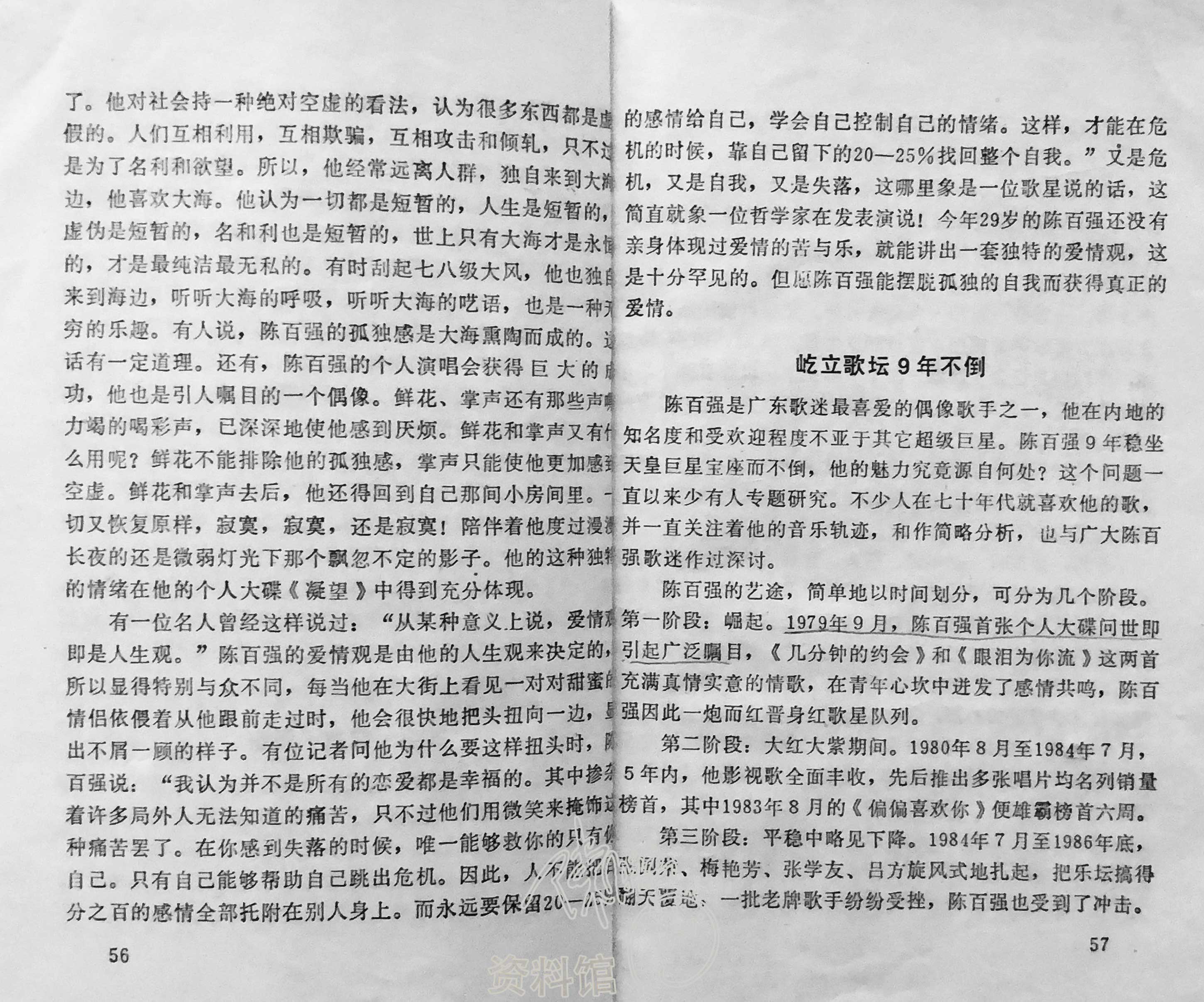 陈百强是广东歌迷最喜爱的偶像歌手之一,他在内地的知名度和受欢迎程度不亚于其它超级巨星。陈百强9年稳坐天皇巨星宝座而不倒,他的魅力究竟源自何处?这个问题一直以来少有人专题研究。不少人在七十年代就喜欢他的歌,并一直关注着他的音乐轨迹,和作简略分析,也与广大陈百强歌迷作过深讨。