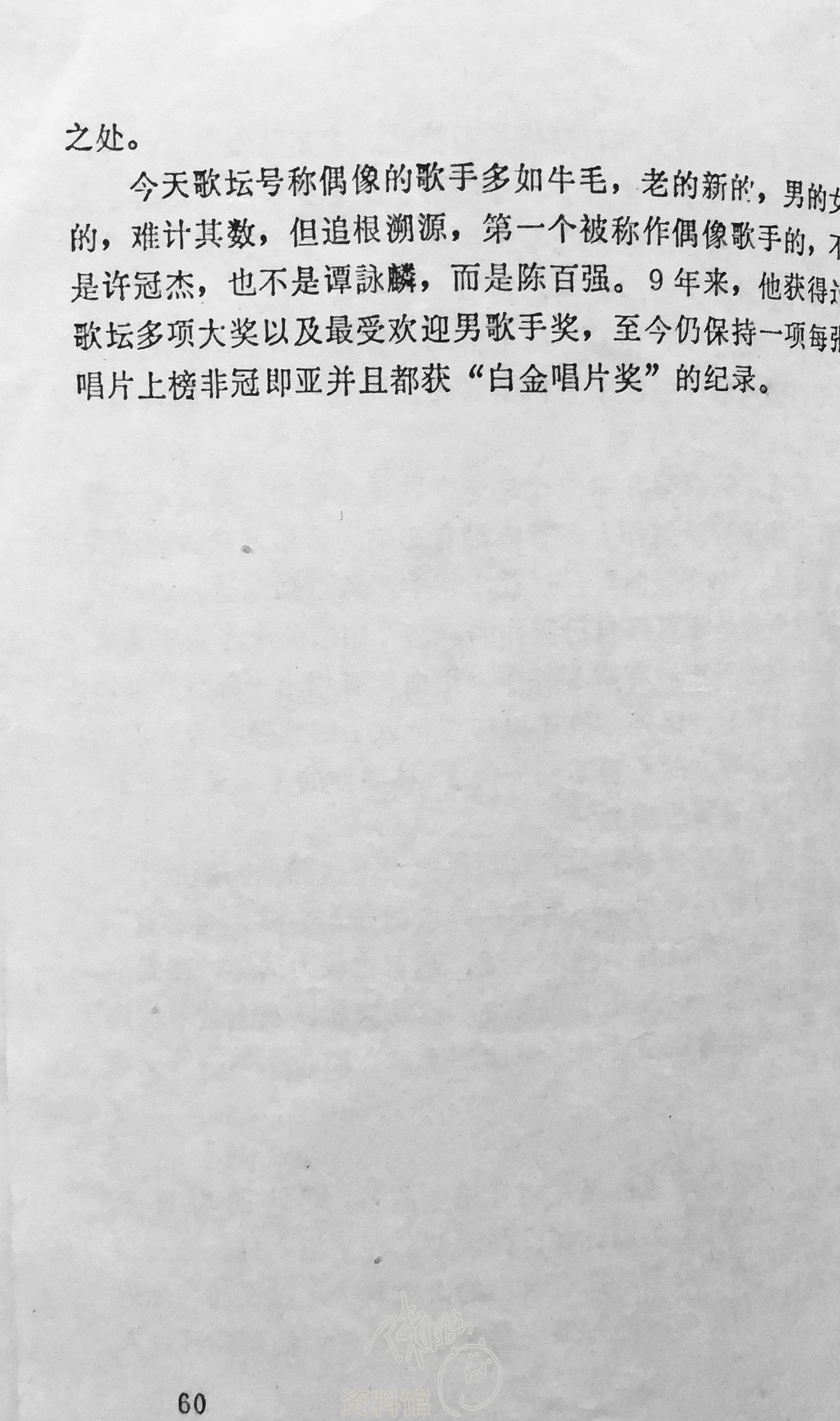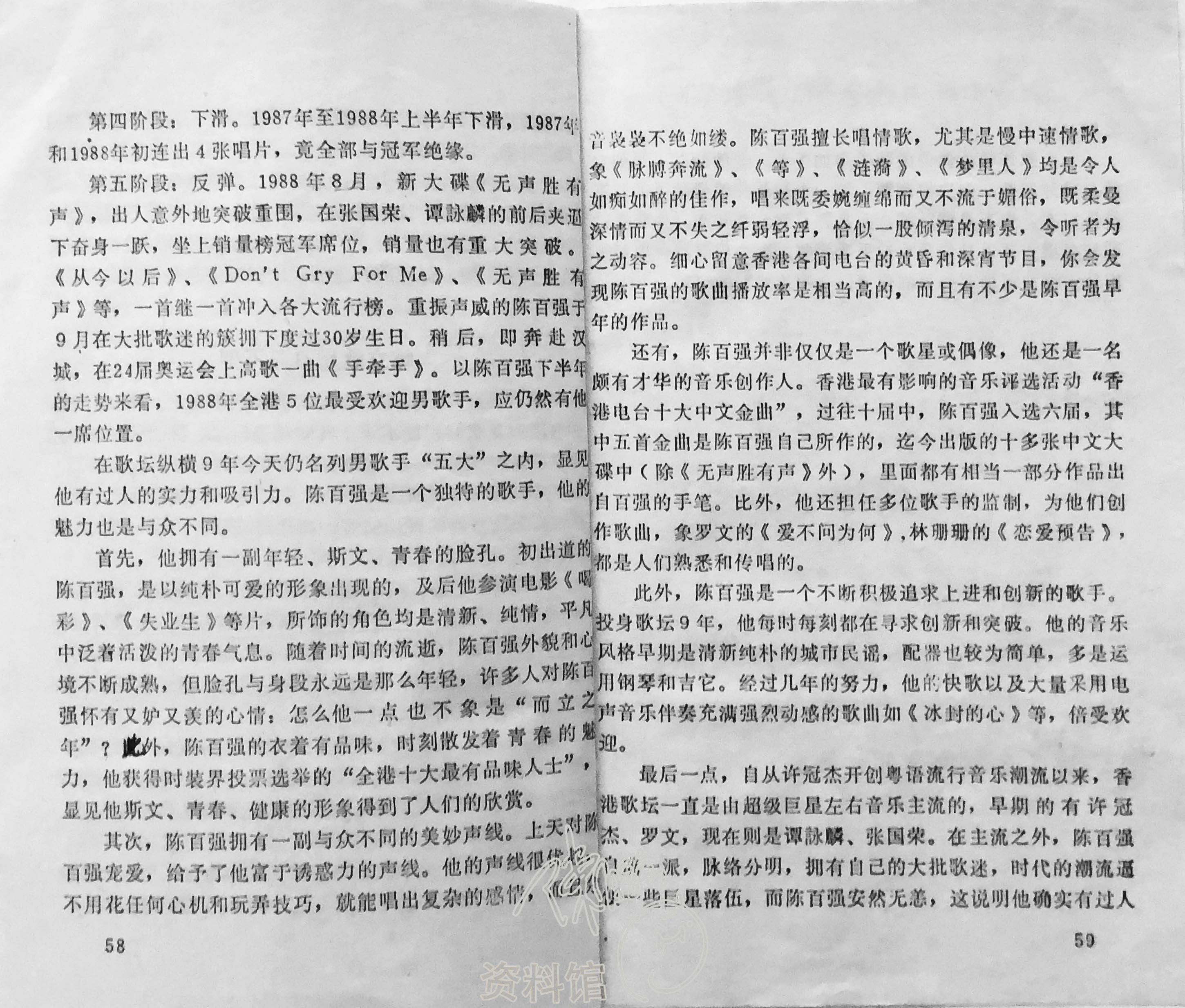 最后一点,自从许冠杰开创粤语流行音乐潮流以来,香港歌坛一直是由超级巨星左右音乐主流的,早期的有许冠杰、罗文,现在则是谭詠麟、张国荣。在主流之外,陈百强自成一派,脉络分明,拥有自己的大批歌迷,时代的潮流逼使一些巨星落伍,而陈百强安然无恙,这说明他确实有过人之处。