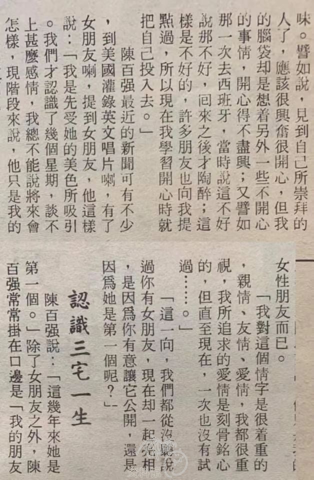 陳百強最近的新聞可有不少,到美國灌錄英文唱片喇,有了女朋友喇,提到女朋友,他這樣說:「我是先受她的美色所吸引。我們才認識了幾個星期,談不上甚麼感情,我總不能說將來會怎樣,現階段來說,他只是我的女性朋友而已。