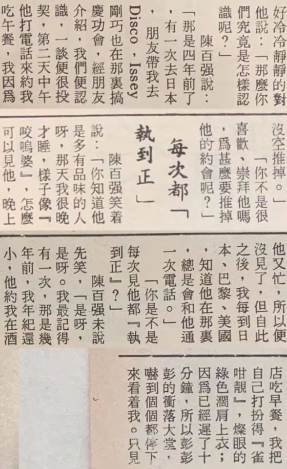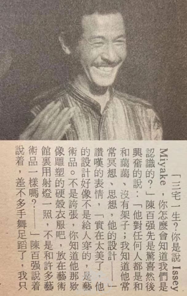 「三宅一生?你是說 Issey Miyake,你怎麼會知道我們是認識的?」陳百強先是驚喜然後興奮的說:「他對任何人都是和和藹藹、沒有架子;我知道他常常冥想、思想,他的設計 ——」 讚嘆的表情,「實在太美了,他的設計好像不是給人穿的,是藝術品。不是誇張,你知道他那款像雕塑的硬殼衣服吧,放在藝術館裏用射燈一照,不是和許多藝術品一樣嗎?——」陳百強說着說着,差不多手舞足蹈了,我只好冷冷靜靜的對他說:「那麼你們究竟是怎樣認識呢?」