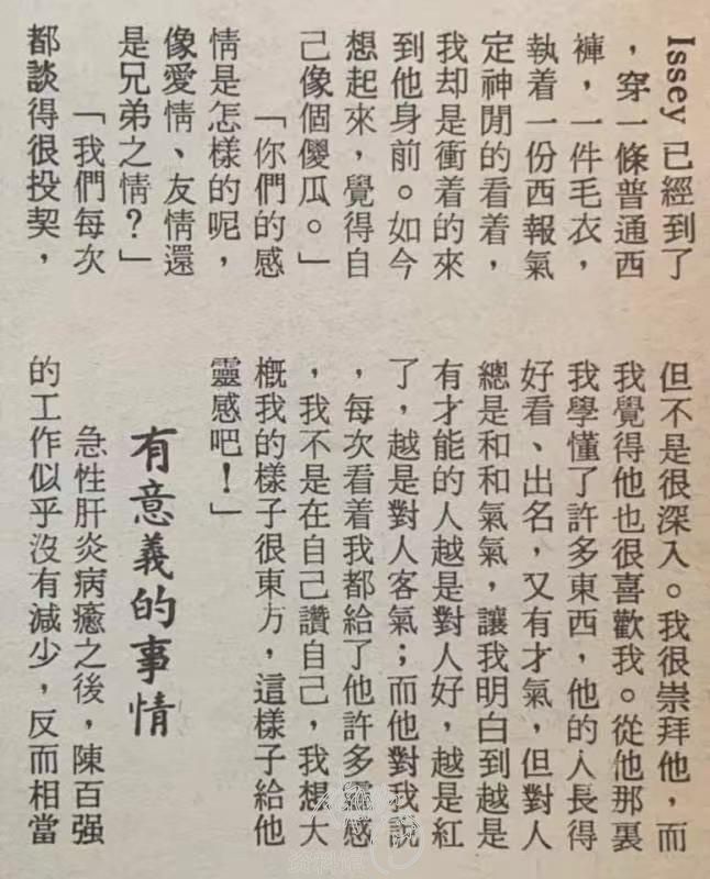 陳百強說:「那是四年前了,有一次去日本,朋友帶我去 Disco,Issey 剛巧也在那裏搞慶功會 ,經朋友介紹,我們便認識,一談便很投契,第二天中午他打電話來約我吃午餐,我因為沒空推掉。」「你不是很喜歡、崇拜他嗎,為甚麼要推掉他的約會呢?」