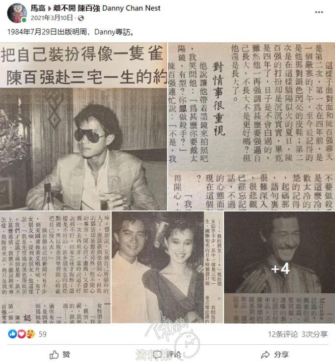 陳百強說:「這幾年來她是第一個。」除了女朋友之外,陳百強常常掛在口邊是 「我的朋友……,我的朋友……。」他的朋友似乎不少,其中一個是三宅一生,國際知名的日本時裝設計師。
