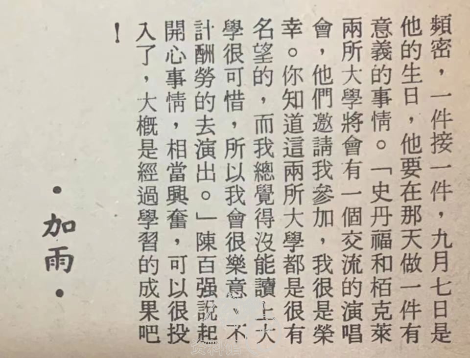 急性肝炎病癒之後,陳百強的工作似乎沒有減少,反而相當頻密,一件接一件,九月七日是他的生日,他要在那天做一件有意義的事情。 「史丹福和相克萊兩所大學將會有一個交流的演唱會,他們邀請我參加,我很是榮幸。你知道這兩所大學都是很有名望的,而我總覺得沒能讀上大學很可惜,所以我會很樂意、不計酬勞的去演出。」 陳百強說起開心事情,相當興奮,可以很投入了,大概是經過學習的成果吧!