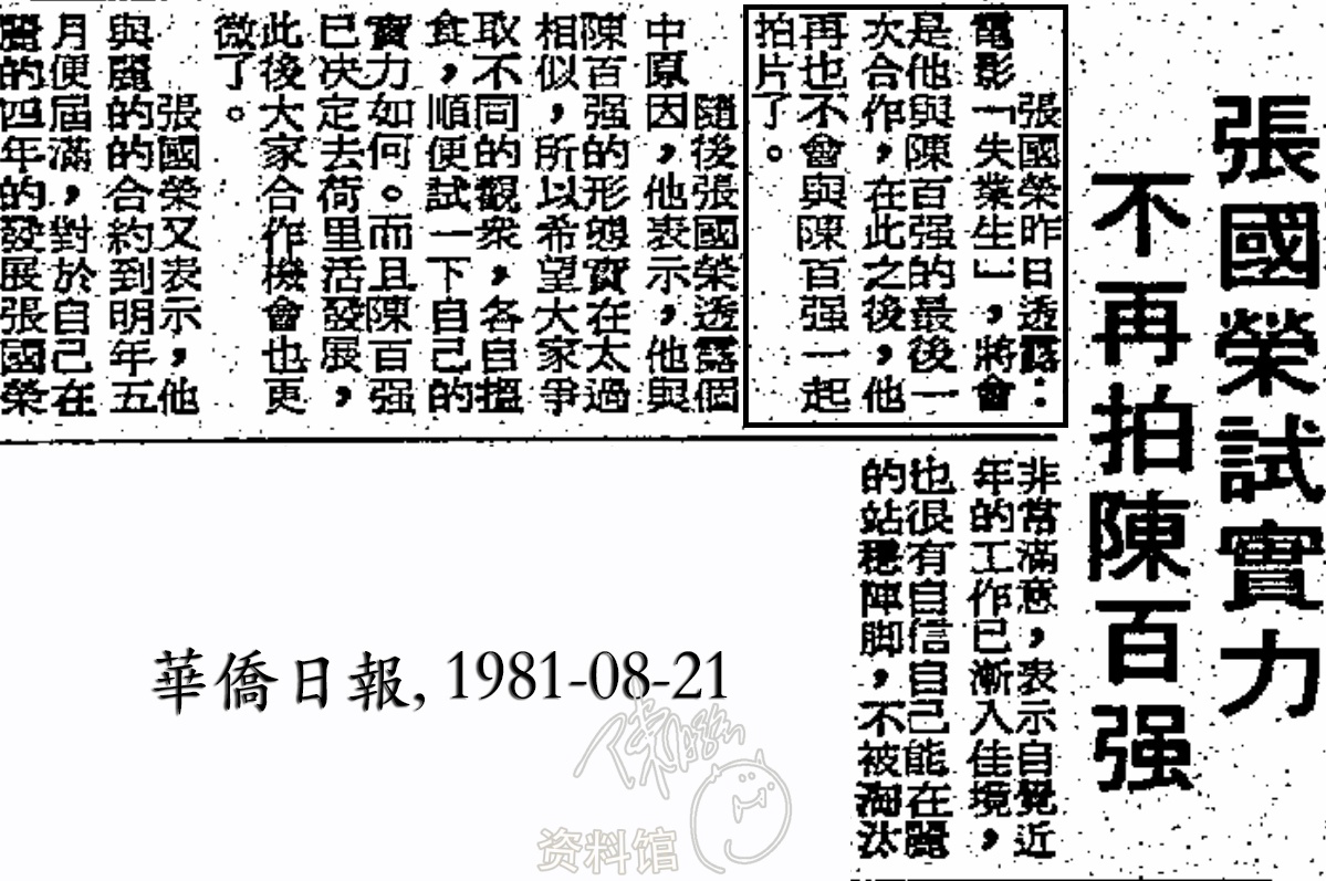 隨後張國榮透露個中原因,他表示,他與陳百強的形態實在太過相似,所以希望大家爭取不同的觀眾,各自搵食,順便試一下自己的實力如何。而且陳百強已決定去荷里活發展,此後大家合作機會也更微了。