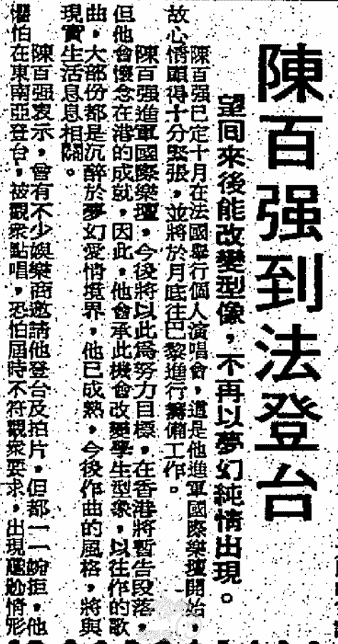陳百強已定十月在法國舉行個人演唱會,這是他進軍國際樂壇開始,故心情顯得十分緊張,並將於月底往巴黎進行籌備工作。