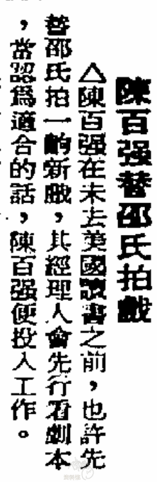 1982.05.21 陳百強替邵氏拍戲 香港工商日報 2024-08-072022-12-09 作者 lh平安陳百強替邵氏拍戲△陳百強在未去美國讀書之前,也許先替邵氏拍一齣新戲,其經理人會先行看劇本,當認爲適合的話,陳百強便投入工作。资料提供:極猫文字录入和校对:飞飞、小鬼