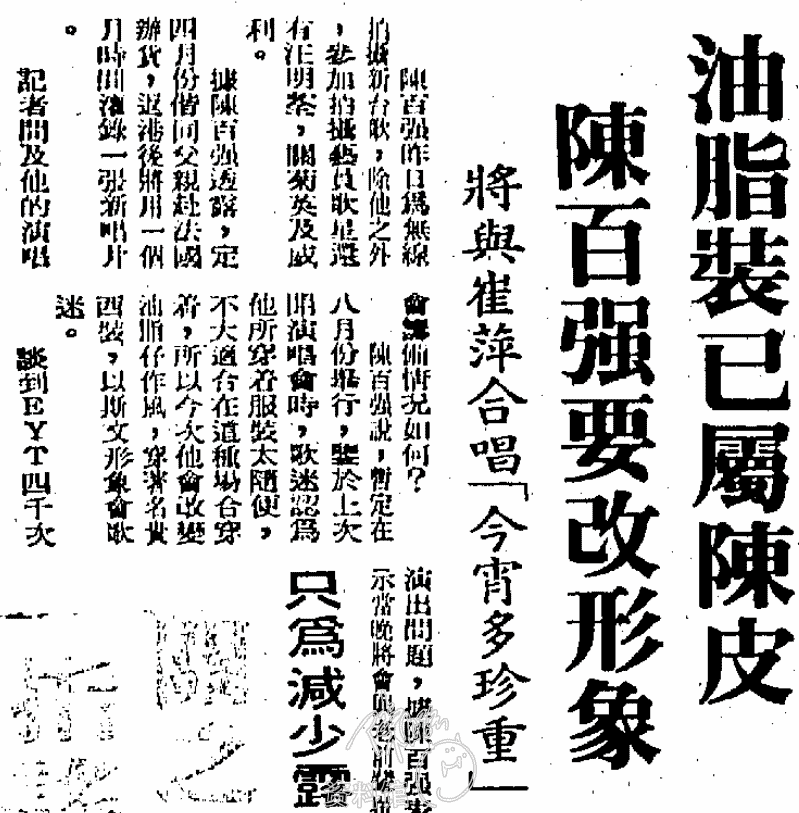 談到EYT四千次演出問題,據陳百強表示當晚將會與老前輩崔萍合唱「今宵多珍重」,這對配搭可說是別開生面。