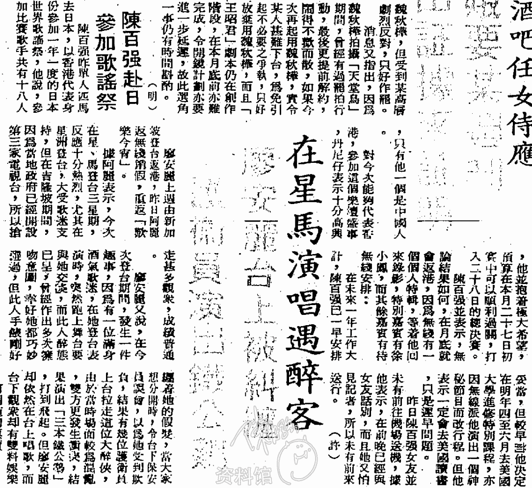 昨日陳百强女友並未有前往機場送機,據他表示,在前晚已經與女友話别,而且她又怕見記者,所以未有前來送行。 (許)