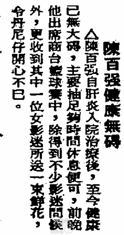 1984.06.11 陳百強健康無礙 香港工商日報 2024-09-122022-12-11 作者 lh平安陳百強健康無碍△陳百強自肝炎入院治療後,至今健康已無大碍,主要抽足夠時間休息便可,前晚他出席商台籃球賽中,除得到不少影迷問候外,更收到其中一位女影迷所送一束鮮花,令丹尼仔開心不已。资料提供:極猫文字录入和校对:飞飞、挚爱百强陈