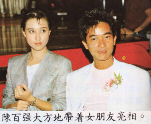 陳百強昨日偕同女友出席港台的招待會,隨即成爲記者爭相訪問的對象,一向大方的陳百強,也表現得很害羞,初時還拒絕與女友一起拍照,但最後也只好大方在一起,當問及與女友相識一事時,陳百強只謂乃私人事,不欲多談,不過,並作了簡短的介紹,女友名叫歌蓮娜,樣貌甜美,與翁靜晶各有幾分相像。