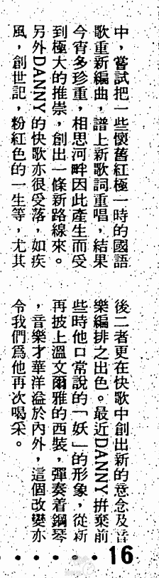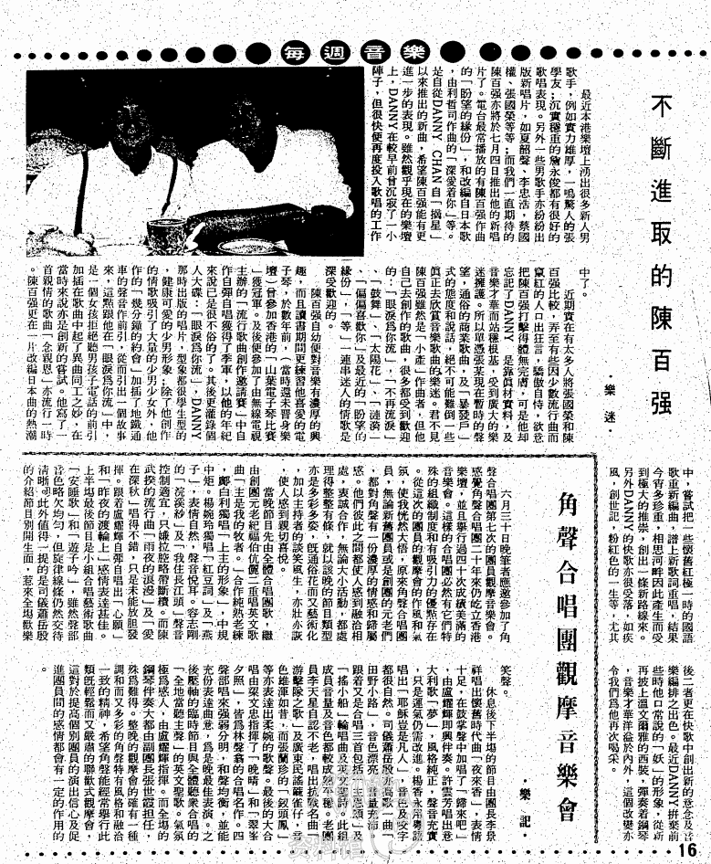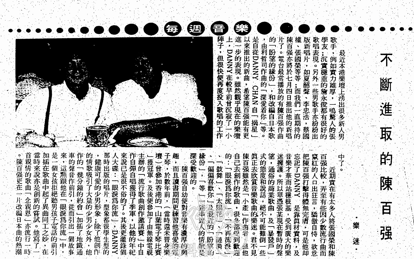 最近本港樂壇上湧出很多新人男歌手,例如實力雄厚,一鳴驚人的張學友;沉實穩重的詹永俊都有很好的歌唱表現。另外一些男歌手亦紛紛出版新唱片,如夏韶聲、李忠浩、蔡國權、張國榮等等;而我們一直期待的陳百強亦將於七月四日推出他的新唱片了。電台最常播放的有陳百強作曲的「盼望的緣份」,和改編自日本歌,由利哲司作曲的「深愛著你」等。是自從DANNY CHAN自「摘星」以來推出的新曲,希望陳百強能有更進一步的表現。雖然觀乎現在的樂壇上,DANNY在較早前曾沉寂了一小陣子,但很快便再度投入歌唱的工作中了。