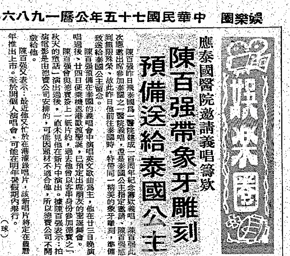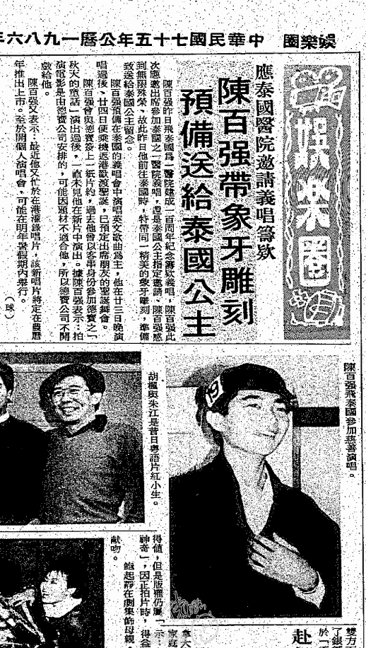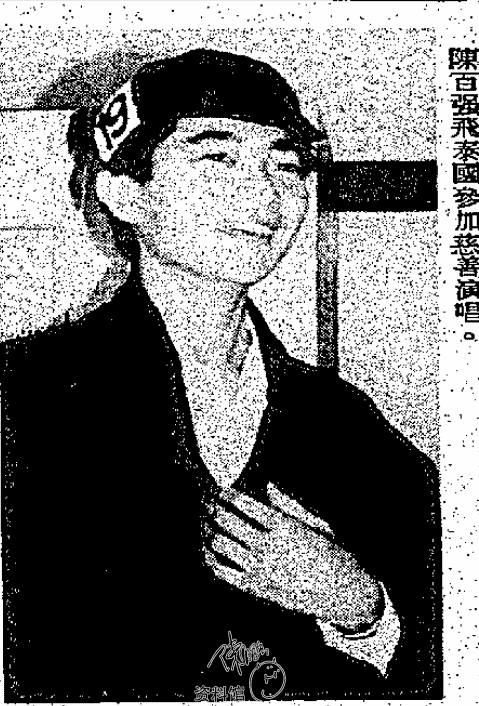陳百強昨日飛泰國爲一醫院建成一百周年紀念籌欸義唱,陳百強此次應邀出席參加泰國之一醫院義唱,還是泰國公主指定邀請、陳百強感到無限殊榮、故此昨日他前往泰國時,特帶同一精美的象牙雕刻,準備致送給泰國公主留念。