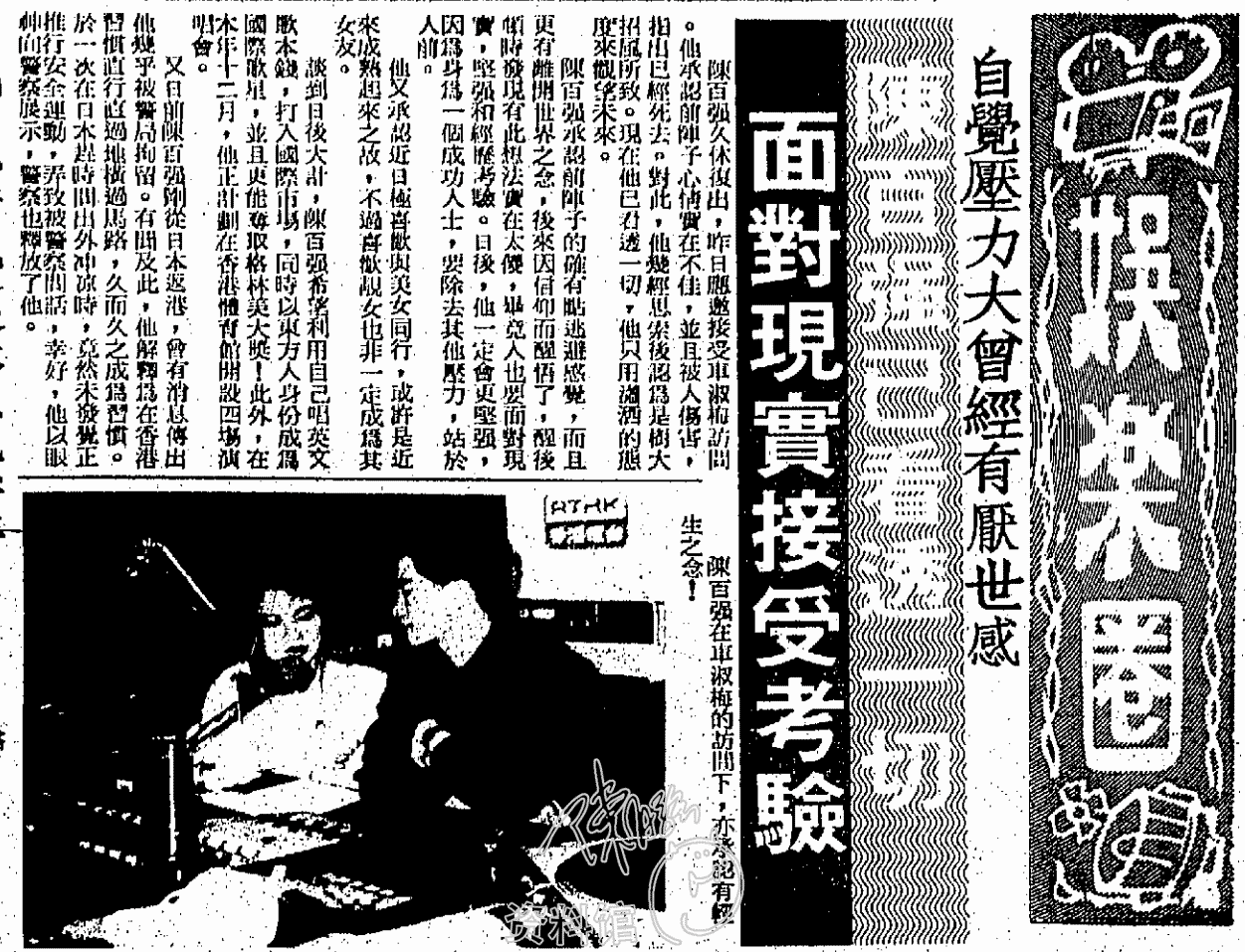 陳百強久休復出,昨日應邀接受車淑梅訪問。他承認前陣子心情實在不佳,並且被人傷害,指出巳經死去。對此,他幾經思索後認爲是樹大招風所致。現在他已看透一切,他只用瀟灑態度來觀望未來。
