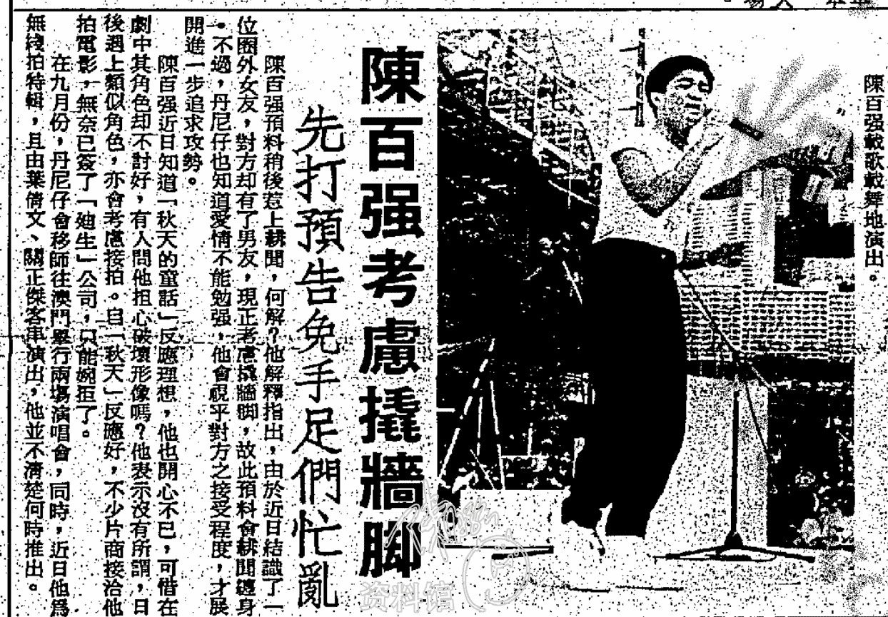 陳百強近日知道「秋天的童話」反應理想,他也開心不已,可惜在劇中其角色却不討好,有人問他擔心破壞形象嗎?他表示沒有所謂,日後遇上類似角色,亦會考慮接拍。自「秋天」反應好,不少片商接洽他拍電影,無奈已簽了「迪生」公司,只能婉拒了。
