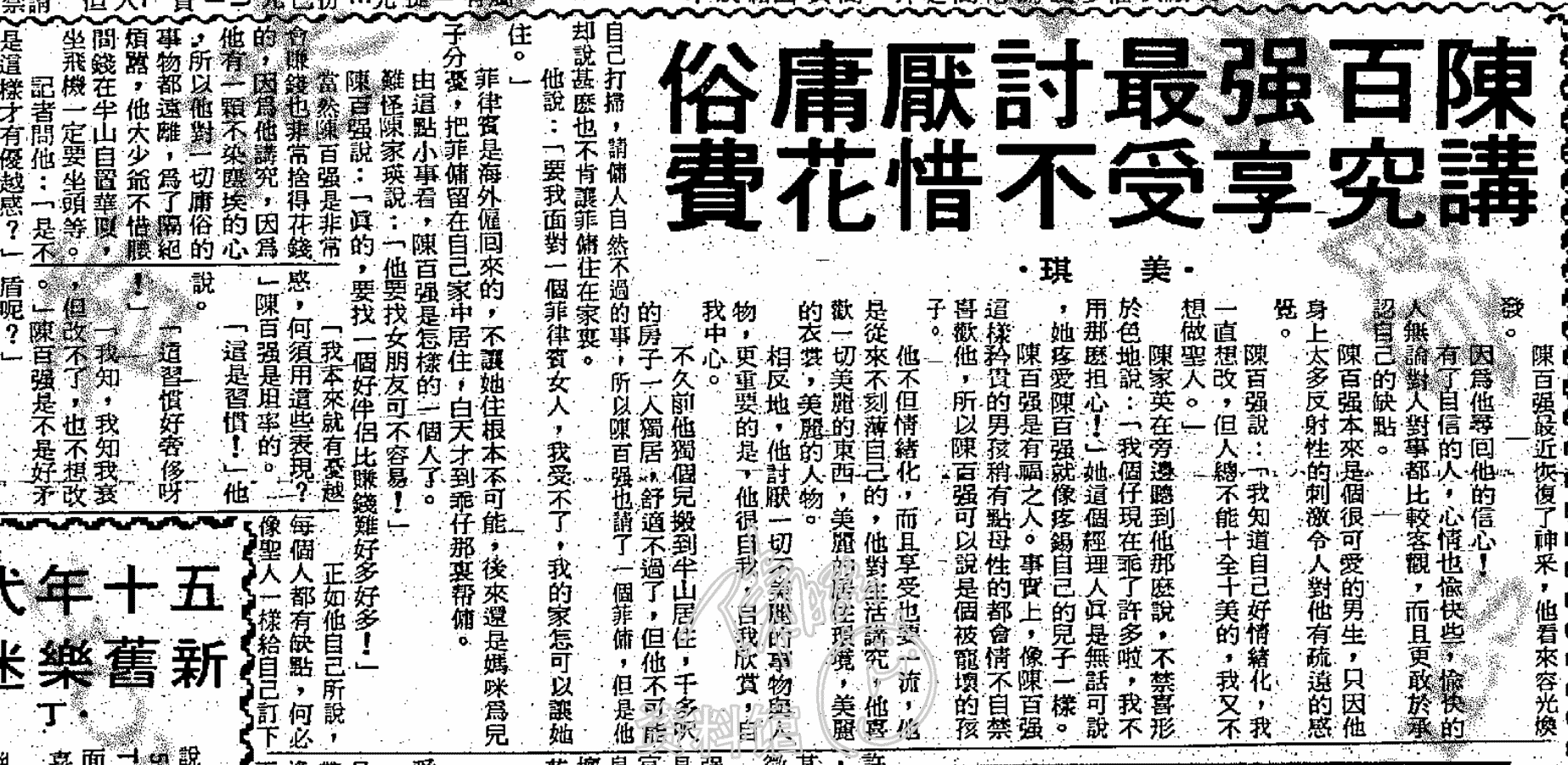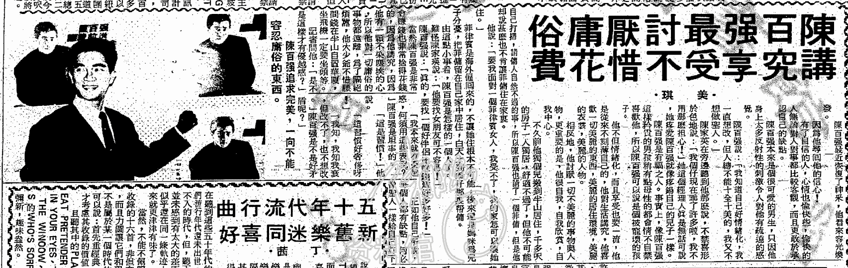 當然陳百強是非常會賺錢也非常捨得花錢的,因為他講究,因為他有一顆不染塵埃的心,所以他對一切庸俗的事物都遠離,爲了隔絕煩囂,他大少爺不惜腰間錢在半山自置華廈,坐飛機一定要坐頭等。