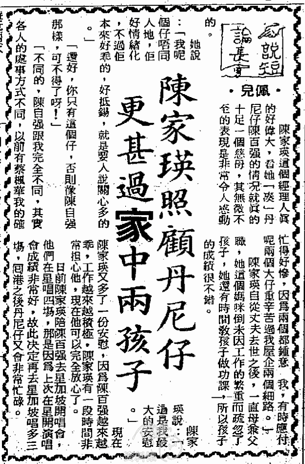 陳家瑛這個經理人真的好偉大,看她「凑」丹尼仔陳百強的情況就眞的十足一個慈母,其無微不至的表現是非常令人感動的。她說:「我呢個仔唔同人地,佢好情緒化,不過佢本來好乖的,好抵錫,就是要人說關心多的。」