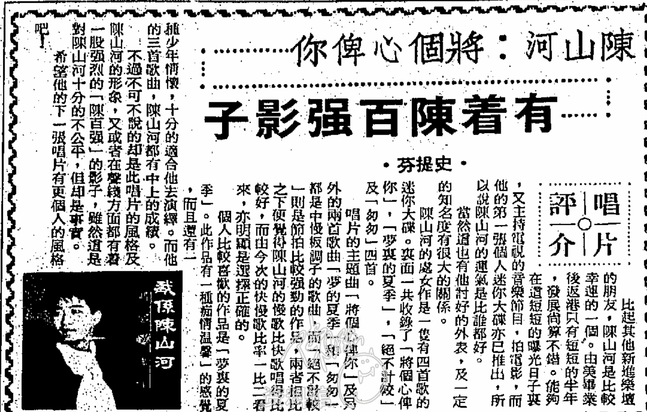 1987.09.02 陳山河 有着陳百强影子 華僑日報 2024-09-152022-12-14 作者 lh平安陳山河:將個心俾你 有著陳百強影子 史提芬不過不可不說的却是此唱片的風格及陳山河的形象,又或者在聲綫方面都有著一股強烈的「陳百強」的影子,雖然這是對陳山河十分的不公平,但却是事實。资料提供:極猫文字录入和校对:飞飞、挚爱百强陈