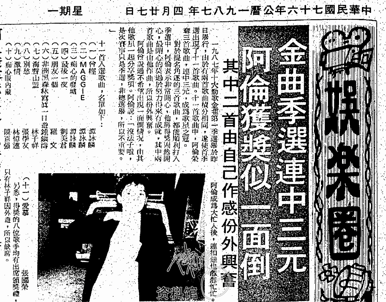 1987.04.27 痴心眼内藏入围金曲季选第十位 華僑日報