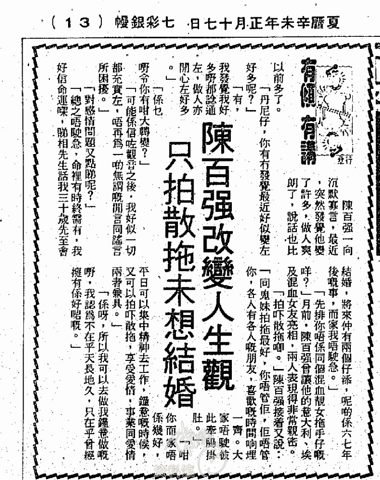「拍吓散拖唧。」陳百強接著又說:「同鬼妹拍拖最好,你唔管佢,佢唔管你,各人有各人嘅朋友,喜歡嘅時間响埋一齊。大家唔駛彼此牽腸掛肚。」「咁你而家唔係幾好,平日可以集中精神去工作,鐘意嘅時候,又可以拍吓散拖,享受愛情,事業同愛情兩者兼具。」「係呀,所以我可以去做我鐘意做嘅嘢,我認爲不在乎天長地久,只在乎曾經擁有係好啱嘅。」