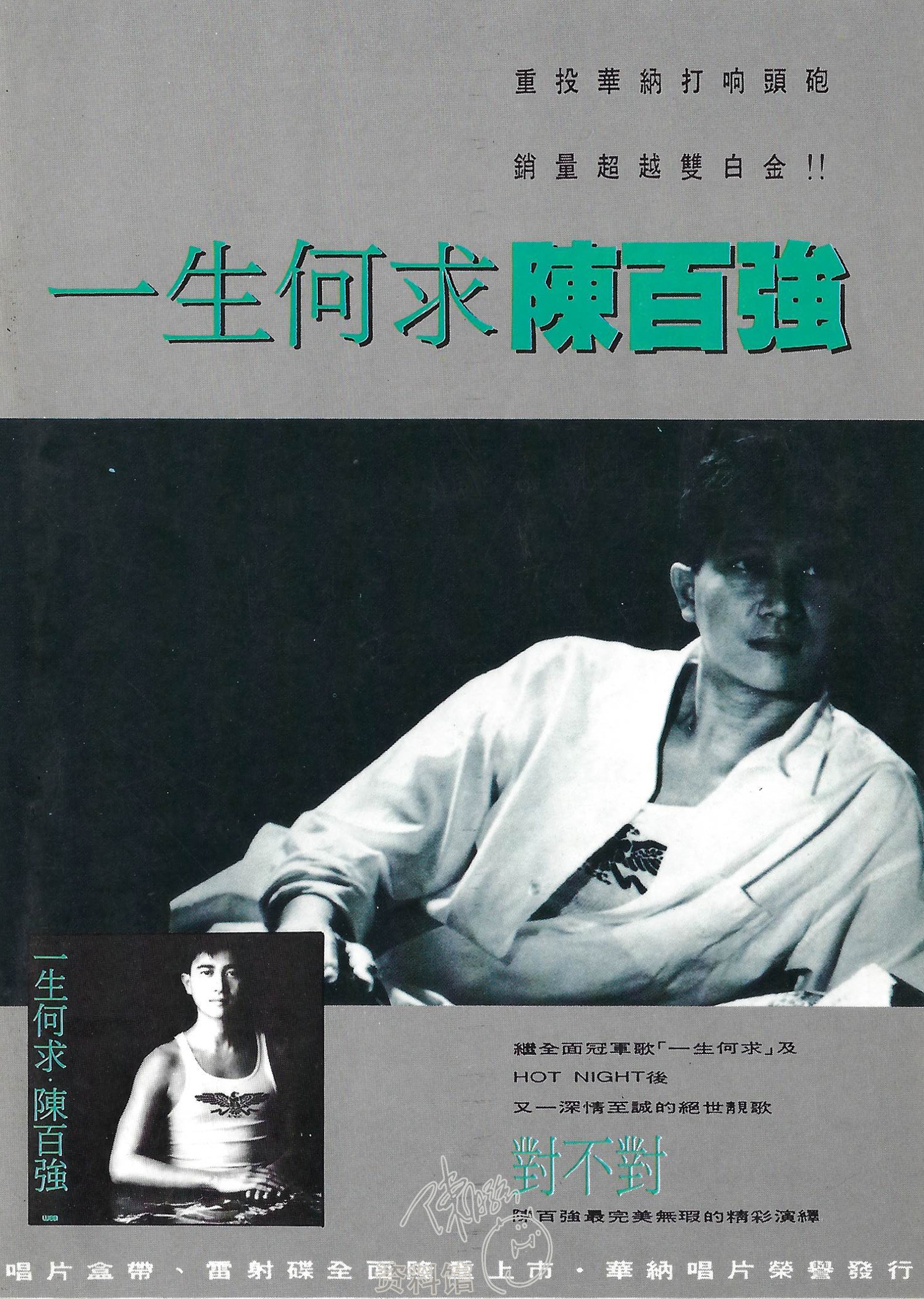 首页 » 期刊报纸扫描 » 1989期刊 » 1989 一生何求 宣传1989 一生何求 宣传 2026-04-092026-03-11 作者 极品猫咪重投華納打響頭砲 銷量超越雙白金!! 一生何求陳百強 繼全面冠軍歌「一生何求」及HOT NIGHT後又一深情至誠的絕世親歌 對不封 陳百強最完美無瑕的精彩演繹唱片盒帶、雷射碟全面隆重上市•華納唱片榮譽發行