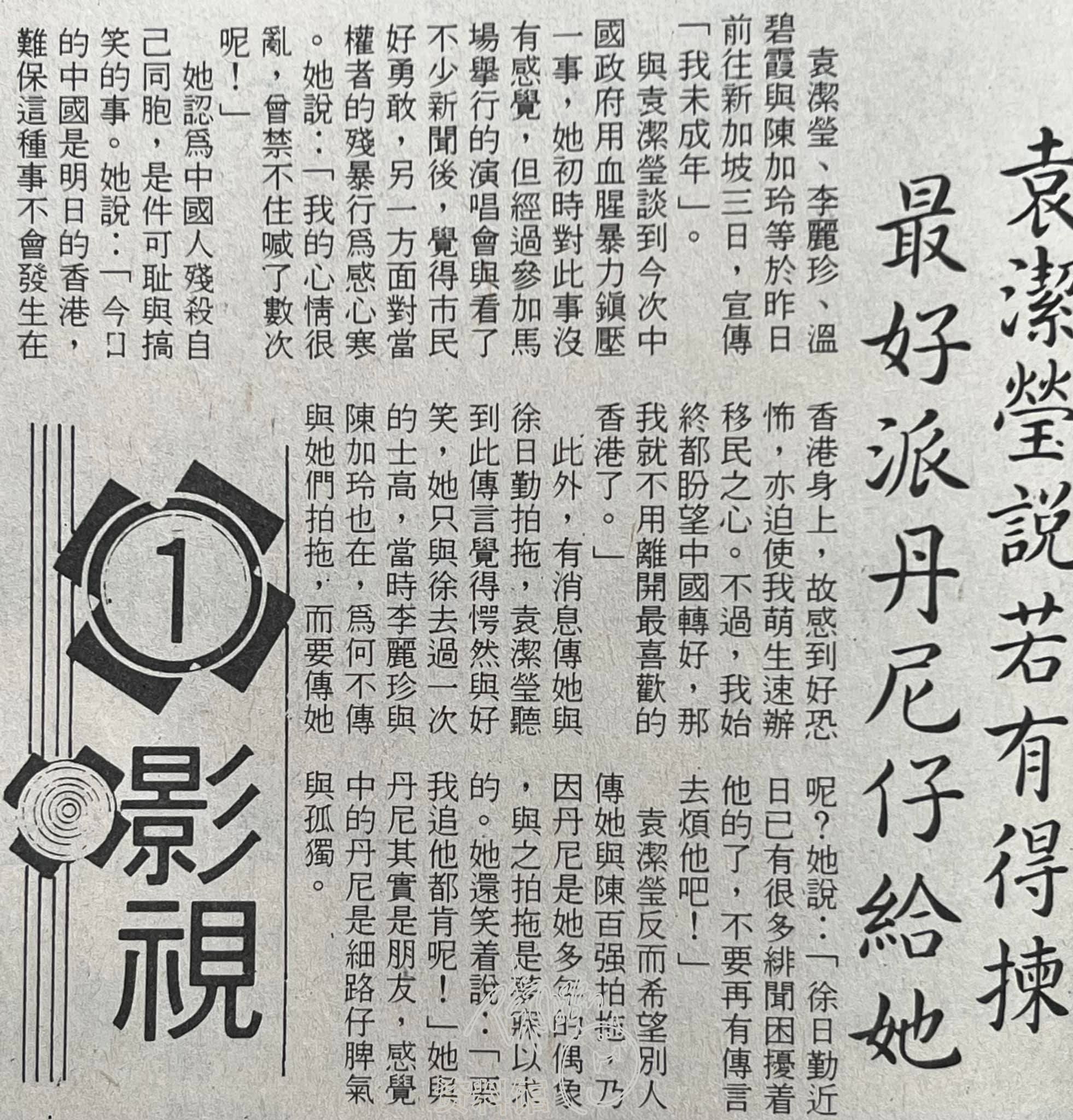 与袁洁莹谈到今次中国政府用血腥暴力镇压一事,她初时对此事没有感觉,但经过参加马场举行的演唱会与看了不少新闻后,觉得市民好勇敢,另一方面对当权者的残酷行为感到心寒。她说:「我的心情很乱,会禁不住喊了数次呢!」