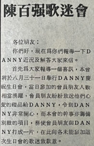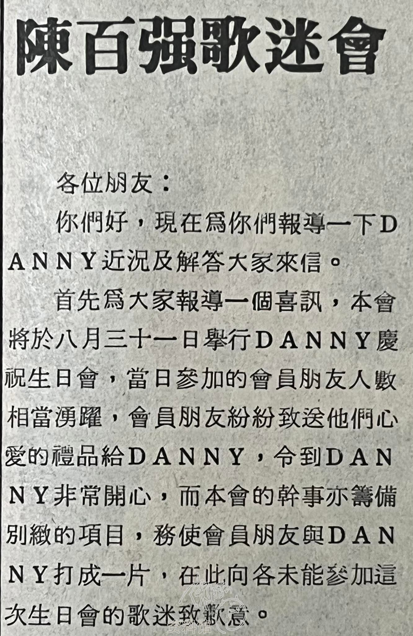 首先爲大家報導一個喜訊,本會將於八月三十一日舉行DANNY慶祝生日會,當日參加的會員朋友人數相當湧躍,會員朋友粉粉致送他們心愛的禮品給DANNY,令到DANNY非常開心,而本會的幹事亦籌備別緻的項目,務使會員朋友與DANNY打成一片,在此向各未能參加這次生日會的歌迷致歉意。