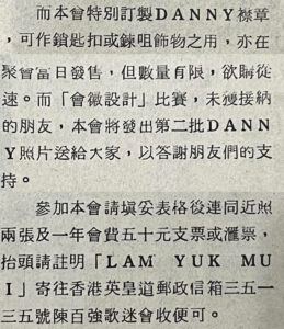 而本會特別訂製DANNY襟章,可作鎖匙扣或鍊咀飾物之用,亦在聚會富日發售,但數量有限,欲購從速。而「會微設計」比賽,未獲接納的朋友,本會將發出第二批DANNY照片送給大家,以答謝朋友們的支持。