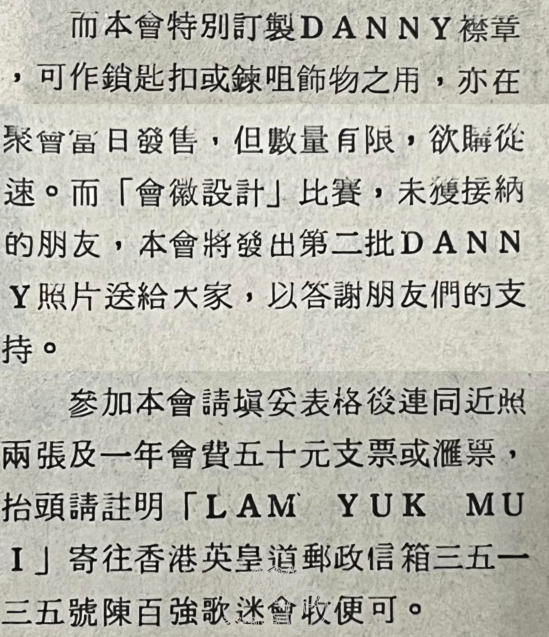參加本會請填妥表格後連同近照兩張及一年會費五十元支票或滙票,抬頭請註明「LAM YUK MUI」寄往香港英皇道郵政信箱三五一三五號陳百強歌迷會收便可。