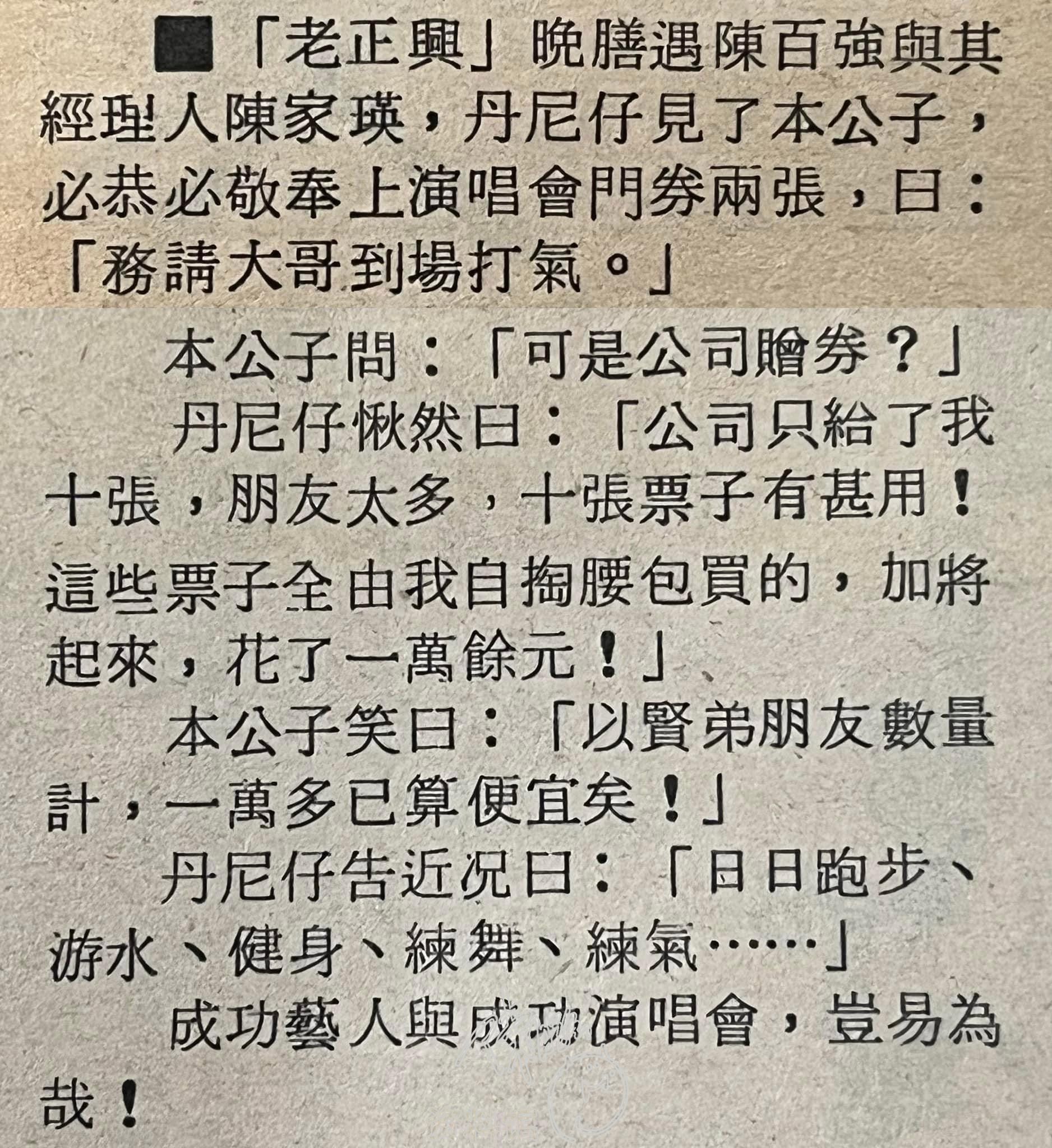 「老正興」晚膳遇陳百強與其經理人陳家瑛,丹尼仔見了本公子,必恭必敬奉上演唱會門券兩張,日:「務請大哥到場打氣。」