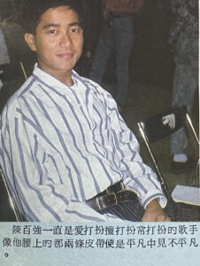 陳百強一直是愛打扮擅打扮常打扮的歌手像他腰上的那兩條皮帶便是平凡中見不平凡.