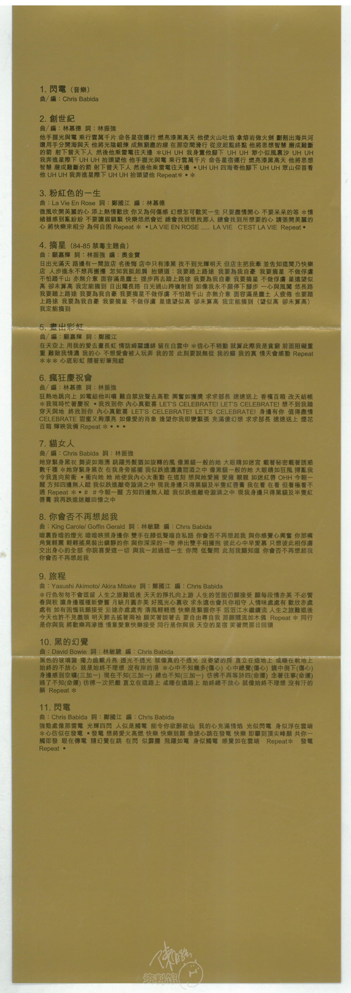 首页 » 大碟欣赏 » 大碟1993年后出版 » 2004.06.01 华纳 百强84 DSD2004.06.01 华纳 百强84 DSD 2017-07-132015-06-21 作者 feifei回到旧版专辑歌词专辑内曲目:1.闪电(音乐) 2.创世记 3.粉红色的一生 4.摘星 (1984年第29,30,31周香港电台中文歌曲龙虎榜周冠军) 5.画出彩虹 6.疯狂庆祝会 7.猫女人 8.你会否不再想起我 9.旅程 10.黑的幻觉 11.闪电 2004华纳DSD-百强84DSD封面 2004华纳DSD-百强84DSD碟面 2004华纳DSD-百强84DSD歌词专辑扫描:叶明1109