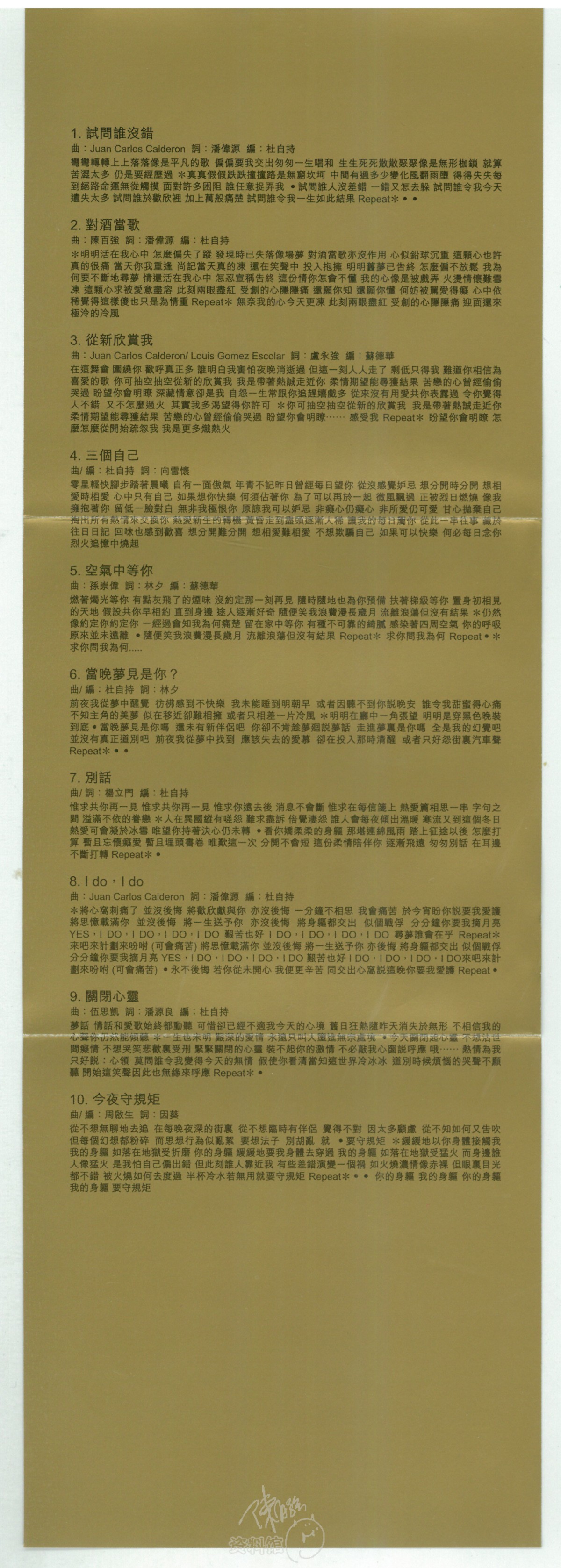 首页 » 大碟欣赏 » 大碟1993年后出版 » 2004.06.10 华纳 等待您DSD2004.06.10 华纳 等待您DSD 2017-07-132015-06-21 作者 feifei回到旧版专辑歌词专辑内曲目:1.试问谁没错 (1990年第8周香港电台中文歌曲龙虎榜周冠军) 2.对酒当歌 3.从新欣赏我 4.三个自己 5.空气中等你 6.当晚梦见是你? 7.别话 8.I do,I do 9.关闭心灵 10.今夜守规矩 2004华纳DSD-等待您封面 2004华纳DSD-等待您碟面 2004华纳DSD-等待您歌词专辑扫描:叶明1109