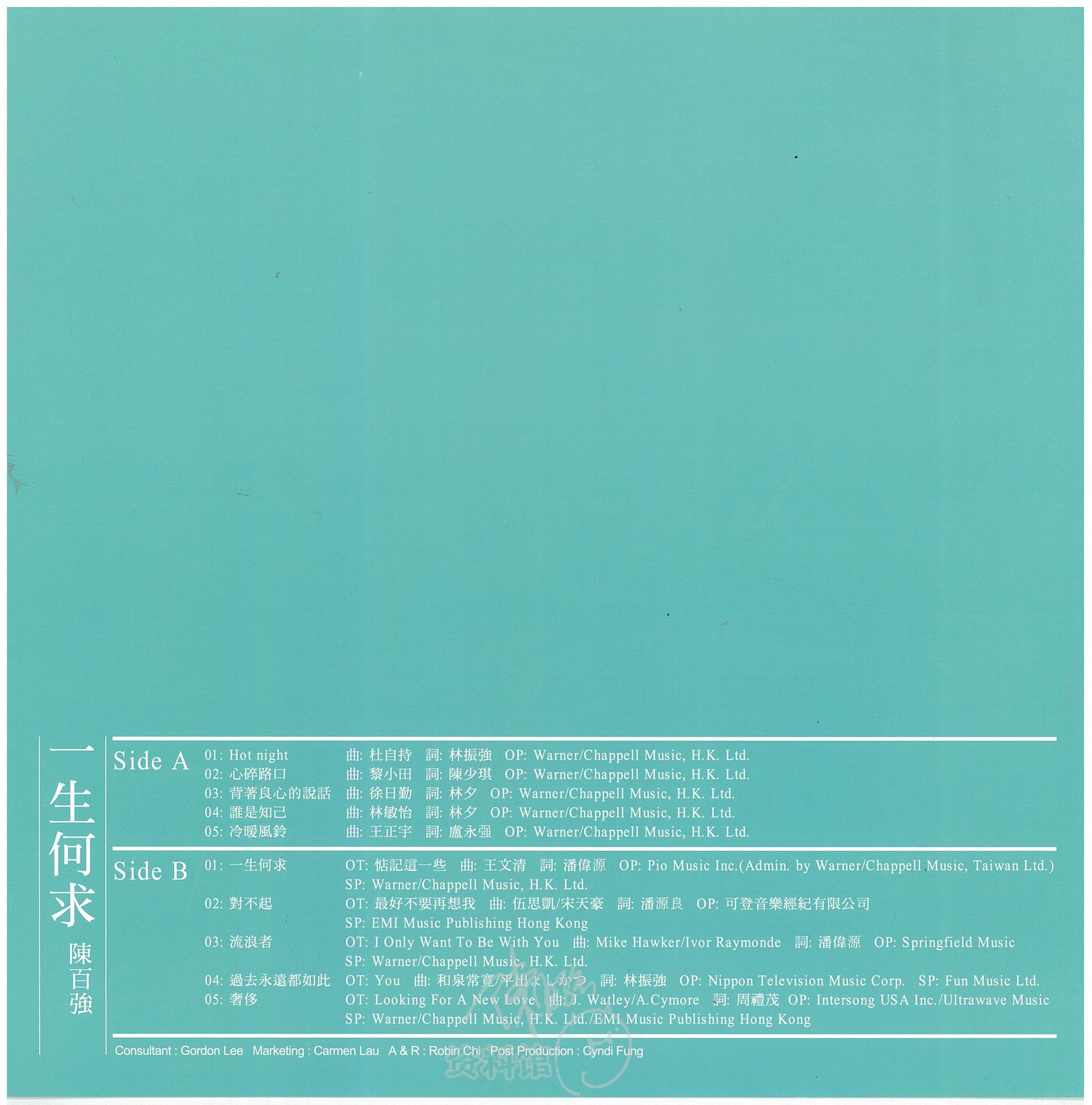 首页 » 大碟欣赏 » 大碟1993年后出版 » 2012.10.19 华纳 一生何求 Vinyl LP(黑胶)2012.10.19 华纳 一生何求 Vinyl LP(黑胶) 2017-07-132015-06-21 作者 feifei回到旧版专辑歌词专辑内曲目:A面: 1.Hot night 2.心碎路口 3.背着良心的说话 4.谁是知己 5.冷暖风铃B面: 1.一生何求 (1989年第19周香港电台中文歌曲龙虎榜周冠军) 2.对不对 3.流浪着 4.过去永远都如此 5.奢侈 2012 一生何求LP封面 2012 一生何求LP封底 2012 一生何求LP歌词1 2012 一生何求LP歌词2 2012 一生何求LP歌词3 2012 一生何求LP歌词4 2012-一生何求LP胶面A 2012-一生何求LP胶面B专辑扫描:叶明1109