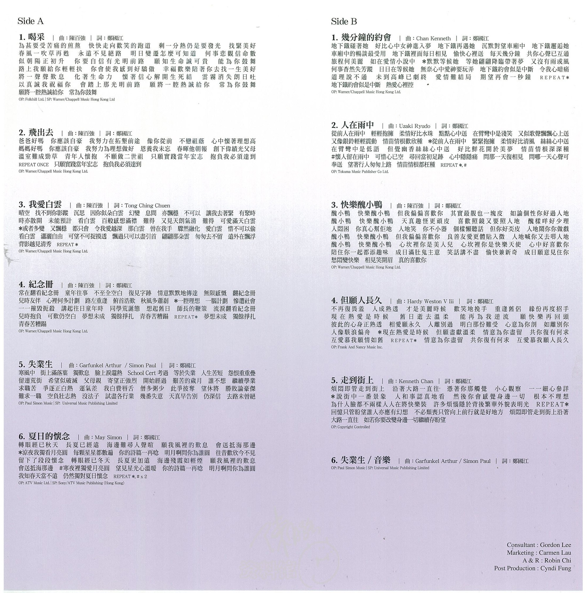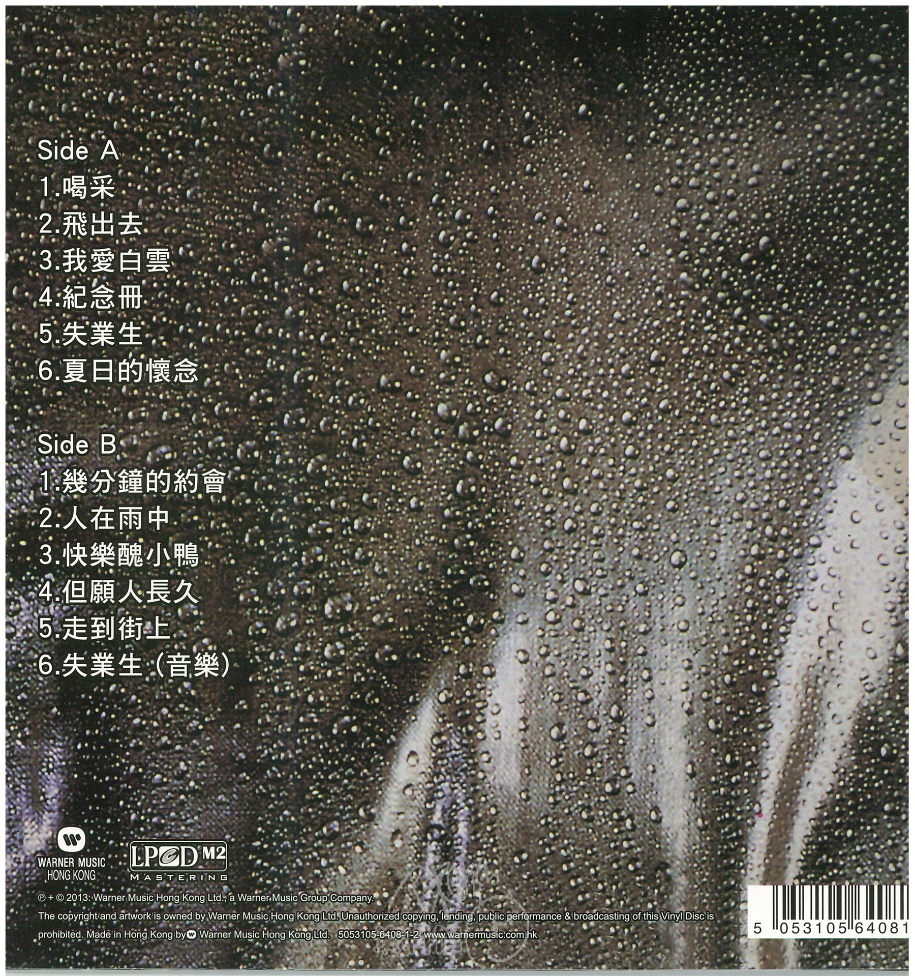 首页 » 大碟欣赏 » 大碟1993年后出版 » 2013.06.07 华纳 与你几分钟约会 Vinyl LP (黑胶)2013.06.07 华纳 与你几分钟约会 Vinyl LP (黑胶) 2021-12-282015-06-21 作者 feifei回到旧版专辑歌词专辑内曲目:A面: 1.喝采 (1981年第2周香港电台中文歌曲龙虎榜周冠军) 2.飞出去 3.我爱白云 4.纪念册 5.失业生 6.夏日的怀念B面: 1.几分钟的约会 2.人在雨中 3.快乐丑小鸭 4.但愿人长久 5.走到街上 6.失业生(音乐) 2013 与你几分钟约会LP封面 2013 与你几分钟约会LP封底 2013 与你几分钟约会LP歌词1 2013 与你几分钟约会LP歌词2 2013-与你几分钟约会LP胶面A 013-与你几分钟约会LP胶面B专辑扫描:叶明1109