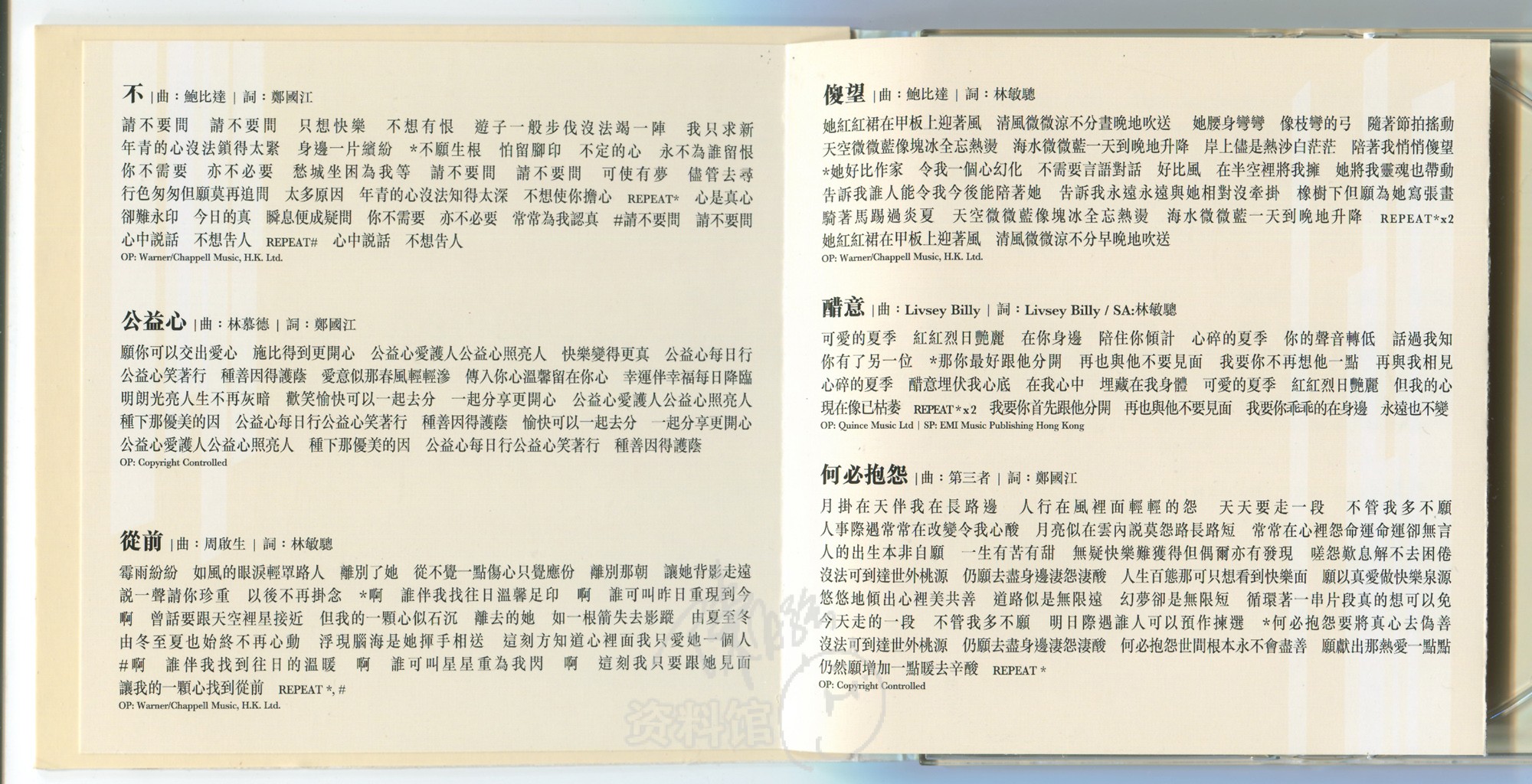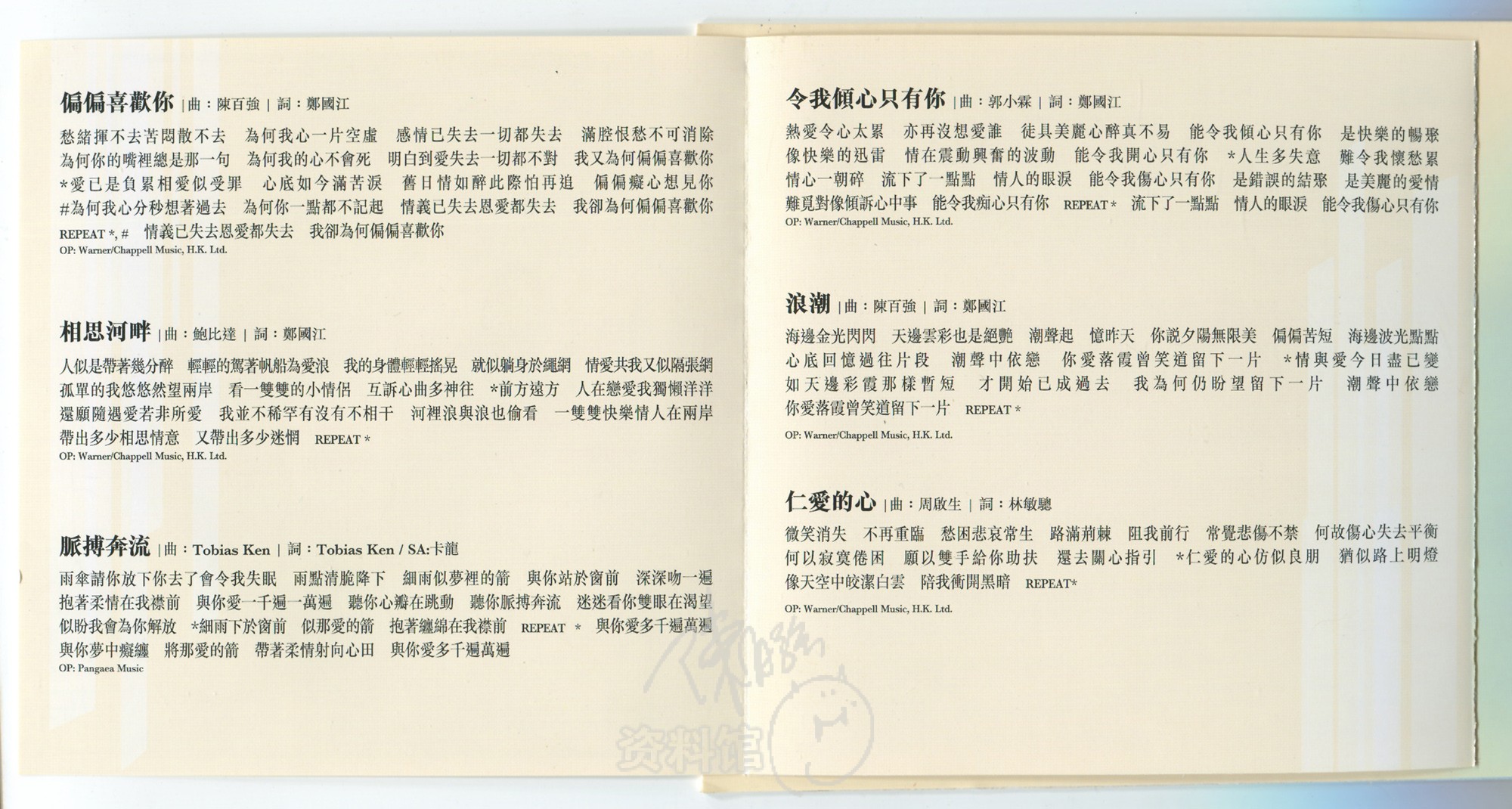 2010.12.21 华纳+EMI 金复刻 偏偏喜欢你 2017-07-132015-07-05 作者 feifei回到旧版专辑歌词专辑内曲目:1.偏偏喜欢你 (1983年第35周香港电台中文歌曲龙虎榜周冠军) 2.相思河畔 3.脉搏奔流 4.令我倾心只有你 5.浪潮 6.仁爱的心 7.不 8.公益心 9.从前 10.傻望 11.醋意 12.何必抱怨 2010华纳金复刻偏偏喜欢你-CD-封面封底 2010华纳金复刻偏偏喜欢你-CD碟面 2010华纳金复刻偏偏喜欢你-CD-歌词1 2010华纳金复刻偏偏喜欢你-CD-歌词2 2010华纳金复刻偏偏喜欢你-CD-歌词3专辑扫描:feifei7461