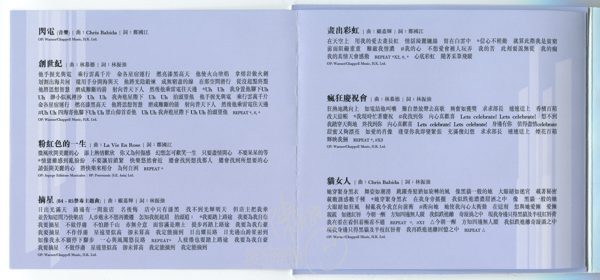 首页 » 大碟欣赏 » 大碟1993年后出版 » 2011.03.04 华纳+EMI 金复刻 百强842011.03.04 华纳+EMI 金复刻 百强84 2017-07-132015-07-05 作者 feifei回到旧版专辑歌词专辑内曲目:1.闪电(音乐) 2.创世记 3.粉红色的一生 4.摘星 (1984年第29,30,31周香港电台中文歌曲龙虎榜周冠军) 5.画出彩虹 6.疯狂庆祝会 7.猫女人 8.你会否不再想起我 9.旅程 10.黑的幻觉 11.闪电 2011华纳金复刻百强84-CD-封面封底 2011华纳金复刻百强84-CD碟面 2011华纳金复刻百强84-CD-歌词1 2011华纳金复刻百强84-CD-歌词2 2011华纳金复刻百强84-CD-歌词3专辑扫描:feifei7461