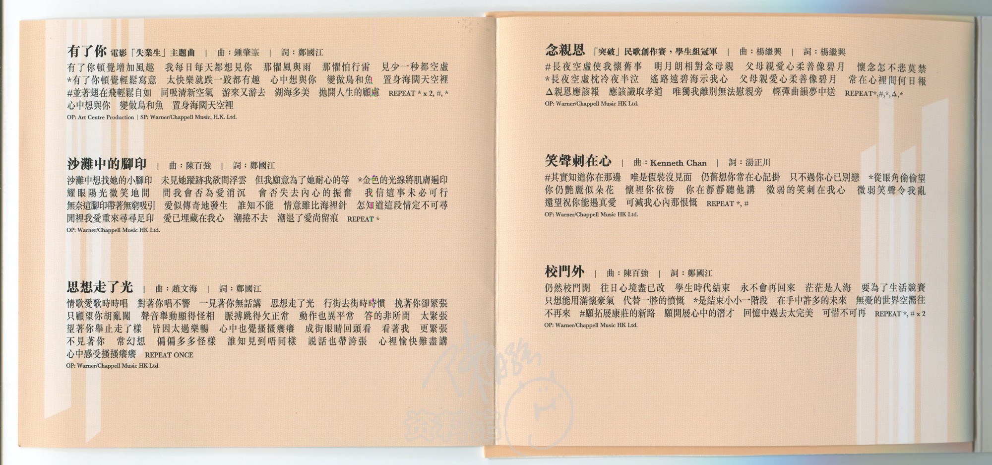 首页 » 大碟欣赏 » 大碟1993年后出版 » 2011.08.23 华纳+EMI 金复刻 有了你2011.08.23 华纳+EMI 金复刻 有了你 2017-07-132015-07-05 作者 feifei回到旧版专辑歌词专辑内曲目:1.有了你 (1981年第35周香港电台中文歌曲龙虎榜周冠军) 2.沙滩中的脚印 3.思想走了光 4.念亲恩 5.笑声刺在心 6.校门外 7.太阳花 8.快乐的拥抱 9.再见,再见 10.乘风破浪 11.片段 12.一个下午 2011华纳金复刻有了你-CD-封面封底 2011华纳金复刻有了你-CD碟面 2011华纳金复刻有了你-CD-歌词1 2011华纳金复刻有了你-CD-歌词2 2011华纳金复刻有了你-CD-歌词3专辑扫描:feifei7461