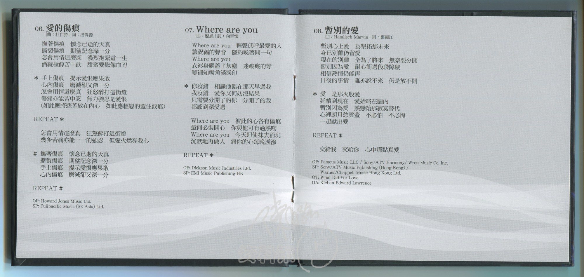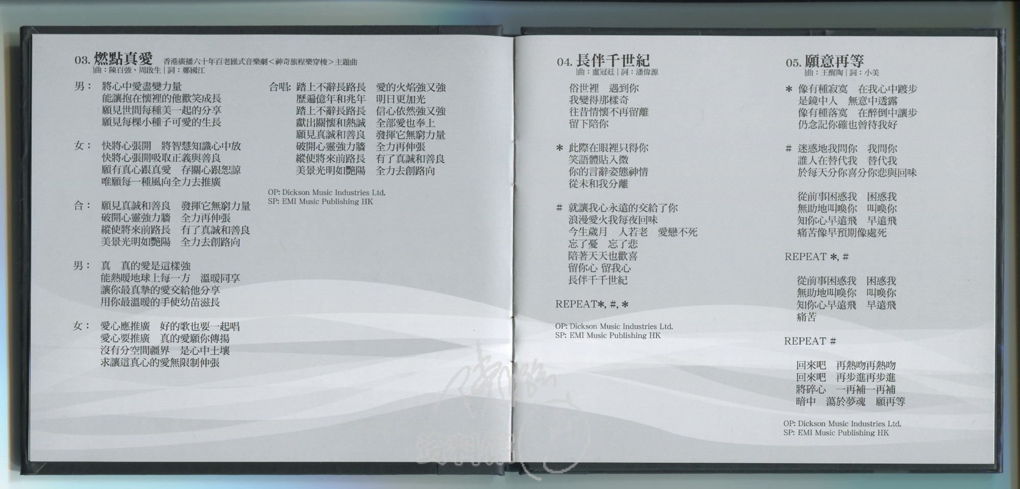 2012.07.04 华纳 冬暖 LPCD45II-CD 2017-07-132015-07-05 作者 feifei回到首版专辑歌词专辑内曲目:1.感情到老 (1989年第1周香港电台中文歌曲龙虎榜周冠军) 2.盼三年 3.燃点真爱 4.长伴千世纪 5.愿意再等 6.爱的伤痕 7.Where are you 8.暂别的爱 9.一语道破 10.冬恋 2012 DMI冬暖-封面封底 2012 DMI冬暖-CD碟面 2012 DMI冬暖-歌词1 2012 DMI冬暖-歌词2 2012 DMI冬暖-歌词3 2012 DMI冬暖-歌词4 2012 DMI冬暖-歌词5 2012 DMI冬暖-歌词6专辑扫描:feifei7461