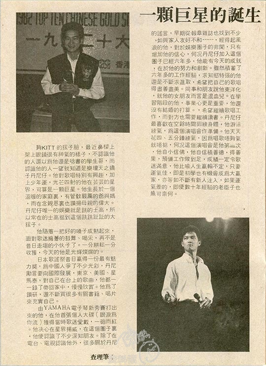 够KIDS的孩子脸,最近鼻梁上架上眼镜很有神气的样子,不认识他的人还以为他还是念书的学生哥,而认识他的人一望就知道是乐坛天之娇子丹尼仔。他对歌唱特别有兴趣,加上少年运,光芒四射的他在芸芸的星界,可算是一颗巨星。他生长于一个温暖的家庭里,有管教严厉的爸与妈,而在念亲恩里也赞扬母亲的伟大。丹尼仔唯一的娱乐就是跳的士高,所以常在的士高揾到这个跳跳趾趾的大孩子。