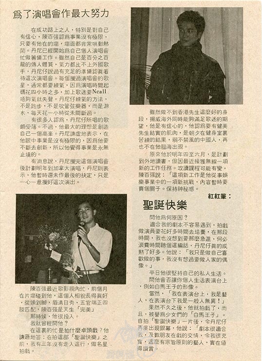 由YAMAHA电子琴新秀赛打出来的他,在他首张个人大碟(眼泪为你流)获得当时歌迷爱戴,一炮而红。他决心在星界扬威,在这个圈子里,他便认识了不少深知朋友,除了在电台、电视认识他外,很多关于丹尼的谣言,早期从报章杂志也找到不少,如与家人好友不和……,经得起风浪的他,对于娱乐圈子的诽闻,只有增加他的信心,何况丹尼仔加入这个圈子已经六年多,他能有今天的成就,在于他的努力和创新。虽然积蓄了六年多的工作经验,求知欲特强的他还是不断求进取,希望把自己的歌唱得尽善尽美。同事和朋友说他东洋化,就他的女朋友而言是混血儿。在学习阶段的他,事业心更是重要,他还没有结婚的打算。希望继续歌唱工作,而对方也需要继续读书。丹尼仔最喜欢在空余时间锻炼身体,他游泳练气,为这个演唱会作准备。他天天花四、五分钟练气,因为唱歌唔够气就唔掂,何况这个演唱会是他第二次,他自小信佛,他自信积善德,得善果,预备工作做到足,成绩一定令歌迷满意,他比喻人生赢输不定,只要运气佳,即是初学也有机会成为大赢家,亦等如不断有新人注入,如果运气差的,即便数十年经验的老臣子也无可奈何。