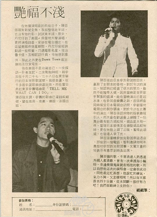 陈百强的歌,不单香港人熟悉连外国人都喜欢。曾有一次乘渡海小轮时,旁边有几个外国妹就在唱他的歌。所以我想他这次的演唱会一定会很成功,问他最近忙什么,他说忙于练气,气力不够,又怎样唱呢!所以每天都游水四十分钟,从未间断。强仔努力吧!我们在精神上支持你。