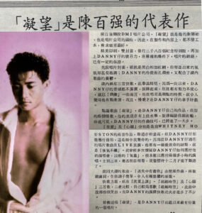 最近,配合他演唱會的宣傳,當然就是最新推出的大碟「凝望」。一張由包裝到内容,都沒有令百強迷失望的唱片。唱片封套那淡淡的紫色,唱片内容那些柔情蜜意的情歌,唱片加插的黑白海報,這一切都是熟識丹尼仔的人,絕對不會意外的配合。而不會意外,又不會失望,就是不簡單的工作。