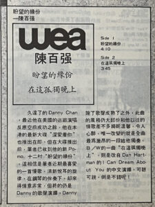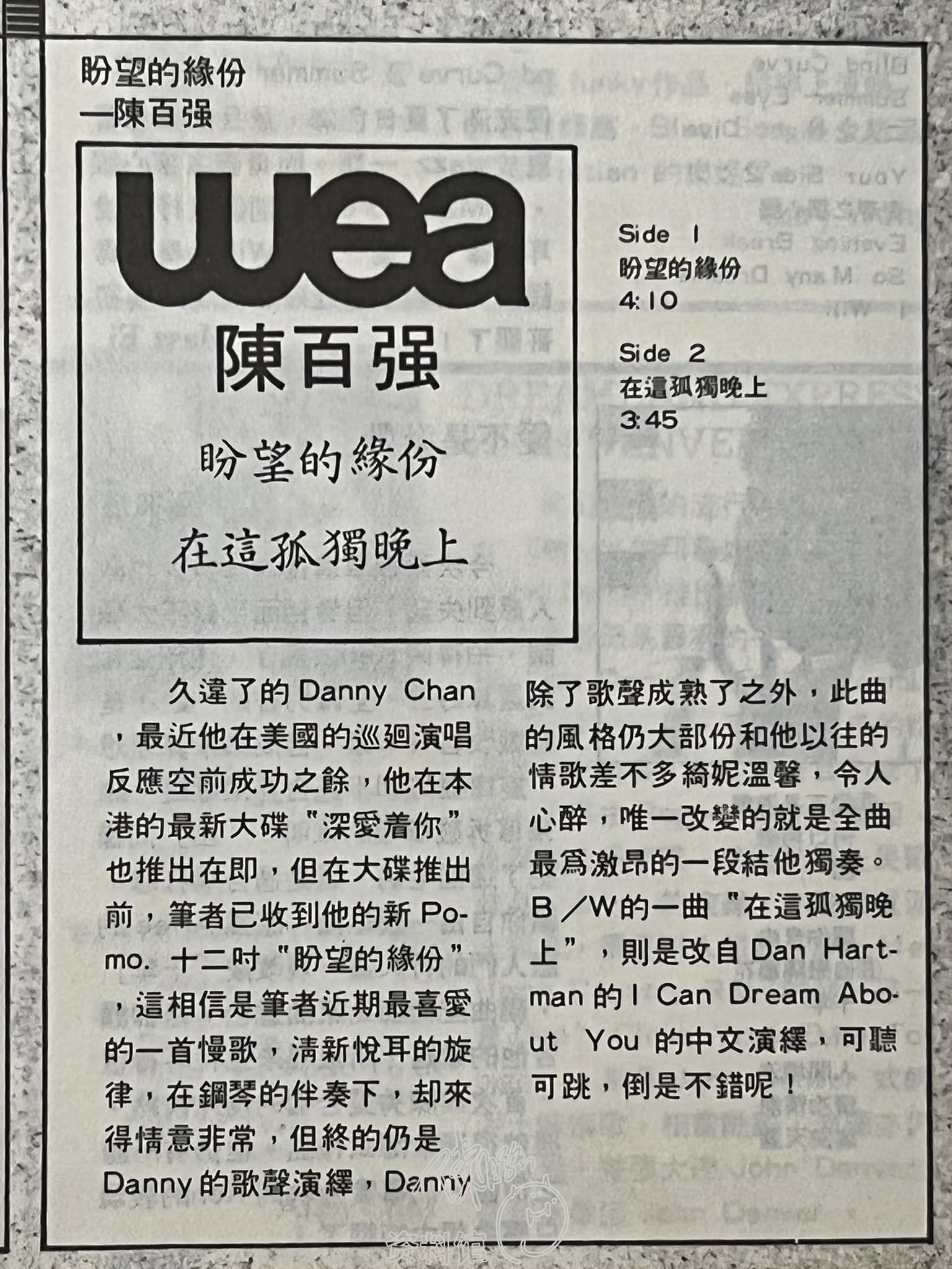 久違了的Danny Chan,最近他在美國的巡廻演唱反應空前成功之餘,他在本港的最新大碟“深愛着你”也推出在即,但在大碟推出前,筆者己收到他的新 Pomo. 十二吋〝盼望的緣份”,這相信是筆者近期最喜愛的一首慢歌,清新悅耳的旋律,在鋼琴的伴奏下,却來得情意非常,但終的仍是Danny 的歌聲演繹,Danny 除了歌聲成熟了之外,此曲的風格仍大部份和他以往的情歌差不多綺妮溫馨,令人心醉,唯一改變的就是全曲最爲激昂的一段結他獨奏。