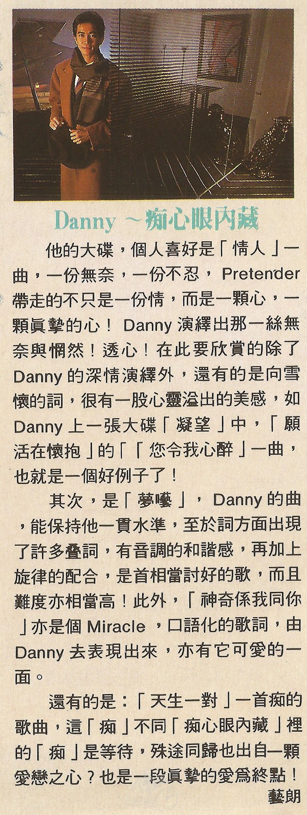 他的大碟,個人喜好是「情人」一曲,一份無奈,一份不忍,Pretender帶走的不只是一份情,而是一顆心,一顆眞摯的心! Danny 演繹出那一絲無奈與惘然!透心!在此要欣賞的除了 Danny 的深情演繹外,還有的是向雪懷的詞,很有一股心靈湓出的美感,如 Danny 上一張大碟「凝望」中,「願活在懷抱」的「「您令我心醉」一曲,也就是一個好例子了!